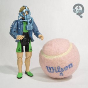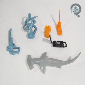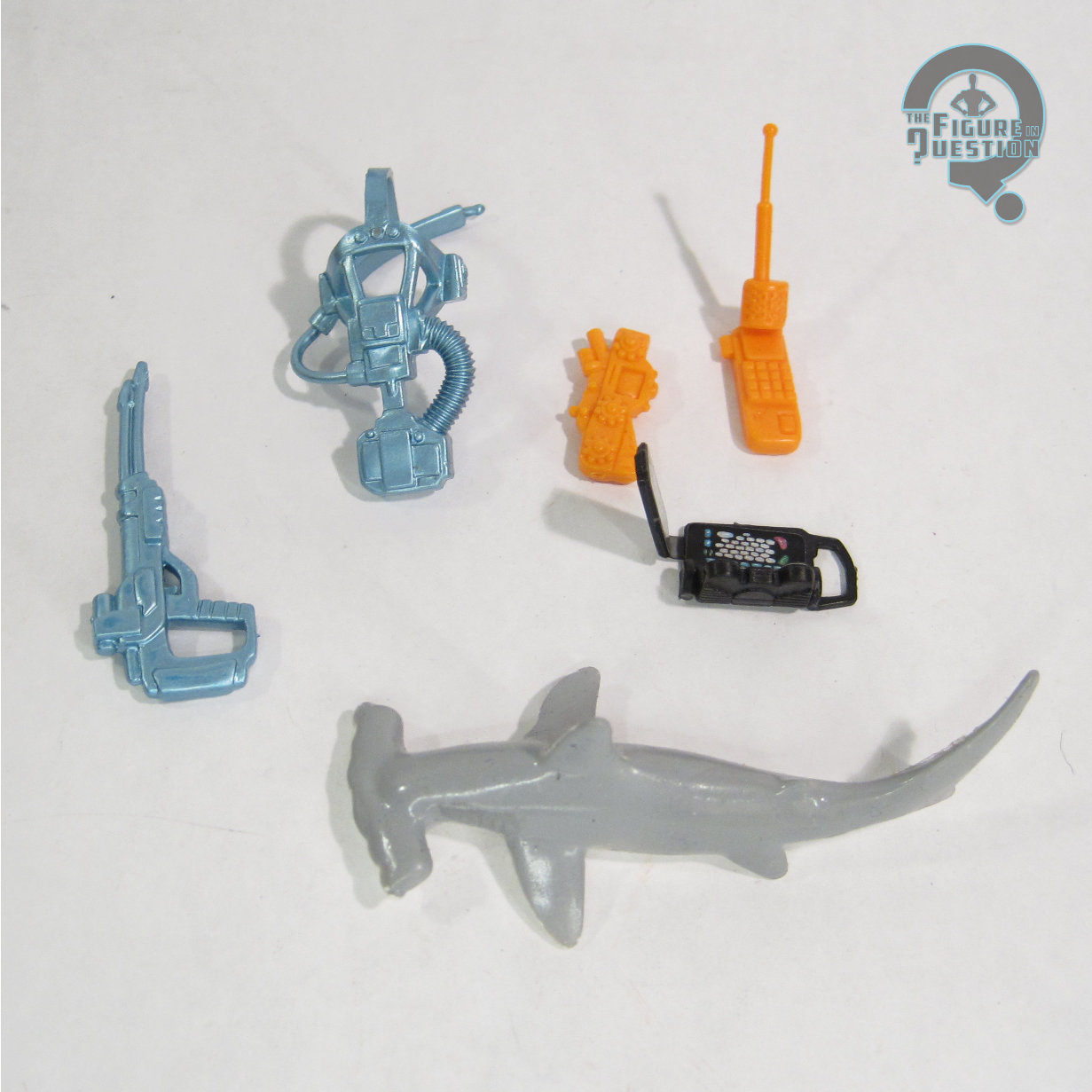 actually wore on the show. He’s got a wetsuit with shorts, some water shoes, and a denim jacket thrown over it. In the first season, Lucas usually just wore civilian attire, always very ‘90s, which might not have been very exciting, I suppose. As it stands, this is a look that, even if it’s not one from the show, feels like it’s something Lucas might wear, so I ca dig it. Lucas’s paint work keeps him removed from the others, with a bit of actual color, specifically some rather lovely green. I particularly like the jacket, and how it’s got an actual denim sort of pattern to it, as well as a pretty cool “UEO” insignia on the back. Lucas is packed with a PAL (Personal Audio Link), SeaPoc computer, mammal vo-corder, EVA Skindiving mask, Spear gun, and a display stand. The tech is all sensible enough, but the spear gun does seem a tad out of place. Also included is a small rubber hammerhead shark, for those that enjoy small rubber hammerhead sharks.