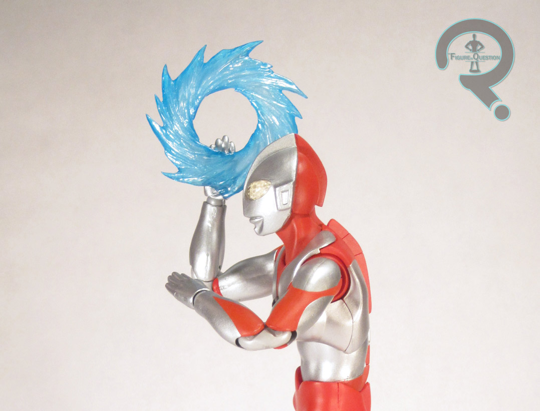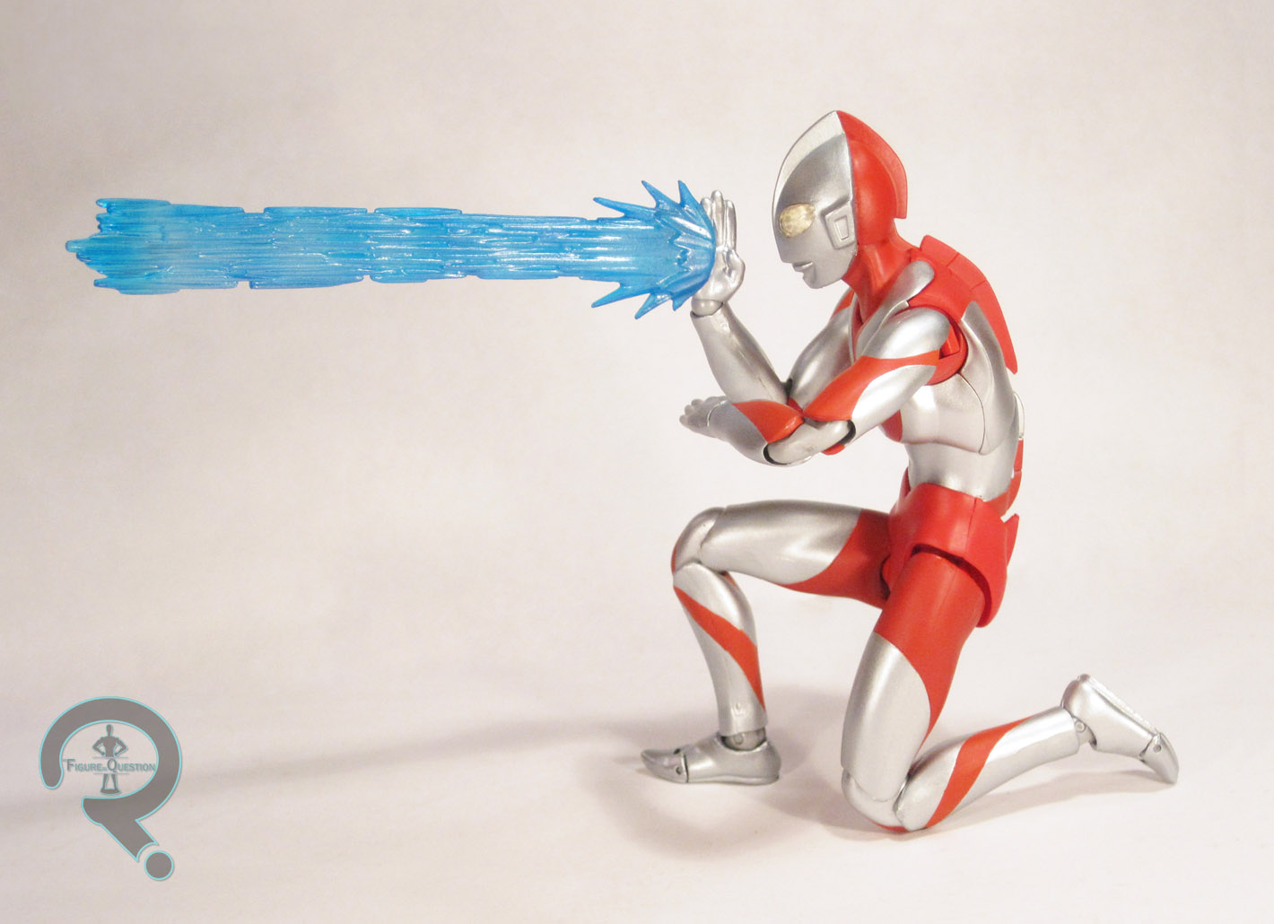 tall and has 40 points of articulation. The sculpt looks fairly accurate to the character’s look on the show. The details are a little soft, but that’s actually appropriate, so no issues there. The eyes are really well done, with the texturing being handled very well. The paint is superb, with no noticeable slop or smudges. The flat finish helps to make it look more realistic, which is cool. The accessories are definitely one of the figure’s coolest areas. Ultraman includes an alternate color timer in red instead of blue, 2 dust clouds that can be placed at Ultraman’s