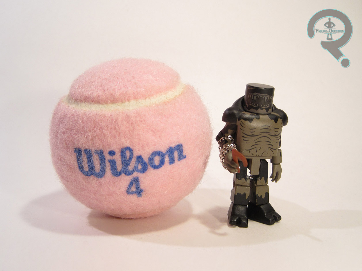 So, the first Ghostbusters had green slime, the second had pink, guess it’s fitting that the game got black slime. And if you’re going to have black slime, you have to have a Black Slime Monster, right? Sure, why not. The Black Slime Monster is just over 2 ½ inches tall and sports 14 points of articulation. The figure uses that standard Minimate body, with specific hands and feet, as well as add-ons for the torso and waist. The hands are from the Marvel Minimates Series 18 Venom (just like Chef Demassi), the feet are from the Series 20 Abomination, and the torso and waist pieces are from the Series 22 movie Abomination. The pieces are all pretty good, and they add up to a pretty decent approximation of the design from the game. The paintwork on the figure is decent. Nothing amazing or anything, but everything’s well applied, and the figure looks appropriately “mucky.” He at the very least makes for a visually interesting monster. The Black Slime Monster included a hook on a chain, which is a re-use from DC Minimates Series 7’s Lobo.