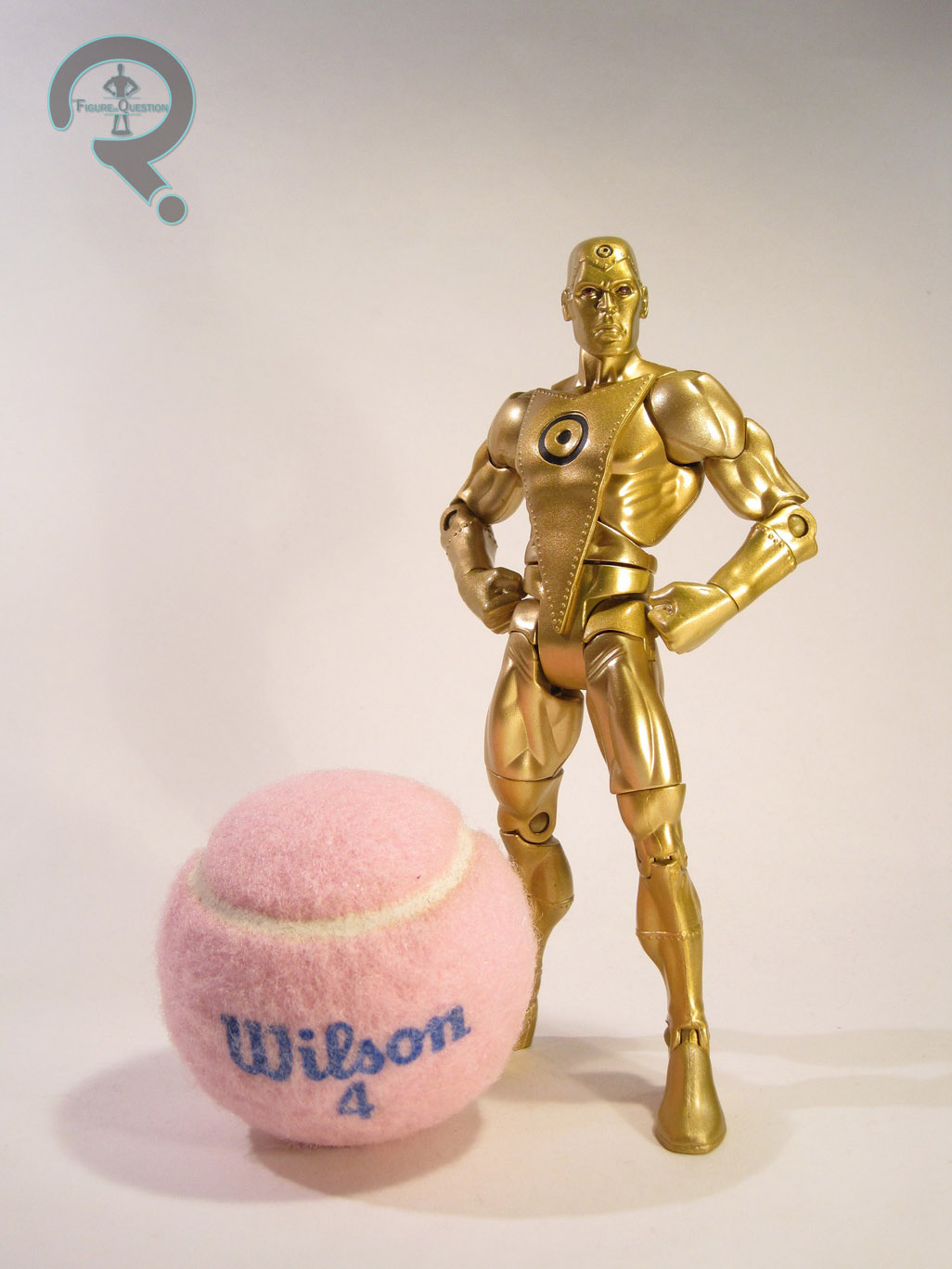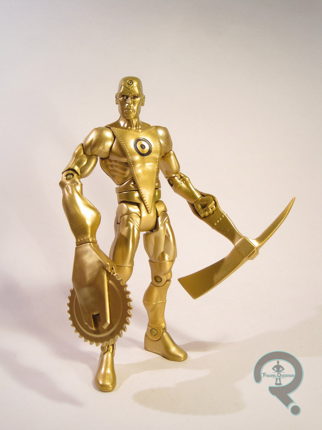 Gold was a figure in Series 14 of DC Universe Classics. Series 14 was the third Walmart exclusive series in the line, and it fell somewhere in between the impossible to find Series 5 and the rather plentiful Series 10 in terms of availability. Gold is a little over 6 inches in height and he features 23 points of articulation (he was released after Mattel removed the ankle rocker joints). He was the second Metal Man released in the line, following Series 12’s Iron. The figure makes use of the mid-size male buck as a starting point, with a new head, forearms, and calves, as well as a set of die-cast hands (first used on Iron), and an add-on for the front of his torso. The mid-size body is a good fit for Gold, so it was well chosen. The new pieces match up pretty well with the body, while giving him some individual flair. The head is the only piece to sport any flaws. It’s not a bad sculpt, but it doesn’t seem quite right for Gold; he should look more confident and self-assured. The hands being actual metal is cool, though the fact that they were originally sculpted for Iron means that they have some dings and things that aren’t quite right for Gold. Gold’s paint is rather straight-forward. He’s painted from head to toe with gold paint. The decision to use paint rather than gold plastic was a wise choice, as the end result is much cleaner. In addition, he also features a few details for his symbol on his head and torso, as well as his eyes. The eyes are rather clean, but the symbols are a slight bit off center. Gold included two hand attachments: a buzz saw and a pick axe. Both are well done, but the buzz saw really stands out, just for the sheer amount of imagination that went into it. If you look closely, you can see that it actually looks like a stretched out version of his hand is holding the blade. It’s a great touch. Gold also included the left leg of the series Collect-N-Connect, Ultra Humanite, who you can read about here.