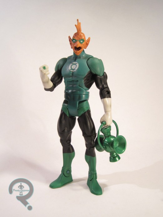 Tomar Re was released in the DC Universe Classics line as part of a Green Lantern themed 5-pack. He was one of two characters released exclusively in the set. Something that’s important to note about this figure is that while he’s called Tomar Re on the box, the figure actually seems to be a bit more in line with the look of Tomar’s son Tomar Tu. The differences are minor: Re was generally depicted with larger eyes with pupils and a less present mask. Ultimately, the two essentially look the same, and Tomar Re is the one more people know, so it’s a forgivable change. The figure is about 6 inches tall and he has 23 points of articulation. Tomar is built on the medium sized male buck, which is a good fit for the character. His right hand has a Green Lantern ring, and it’s been used on numerous GL figures. He has a new head, though it appears it uses the previously released Romat Ru’s head as a starting point. Romat’s scars have been filled in and a mask has been added, which is enough to sufficiently differentiate the two. The head is a truly beautiful sculpt, and it does a fantastic job of translating Tomar’s look into three dimensions. The paint work on Tomar is nicely done. Everything is very clean, and all of the details are sharp. It’s hard to tell from the pictures, but the green used here is slightly iridescent, which looks really cool and gives the costume the appropriate other-worldly vibe. Tomar includes his lantern-shaped power battery, which is a re-use of the one included with the Series 3 Hal Jordan figure. It’s been done in a darker green, which really makes it work.