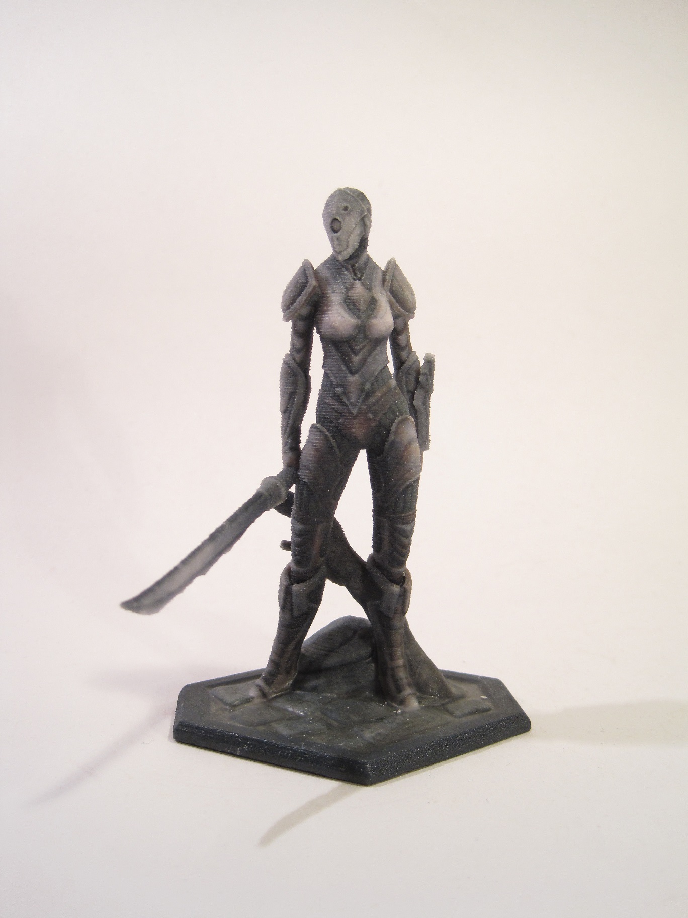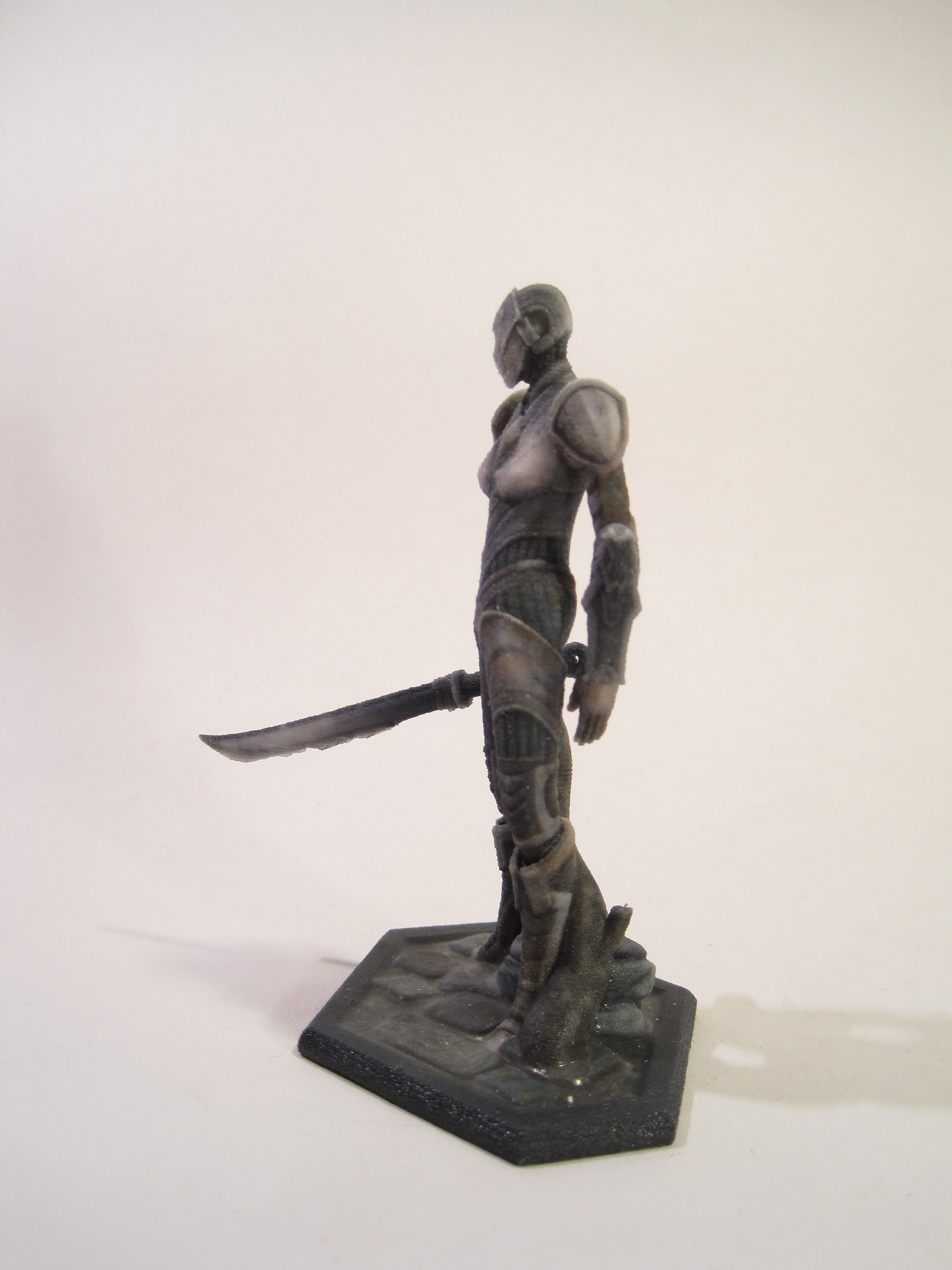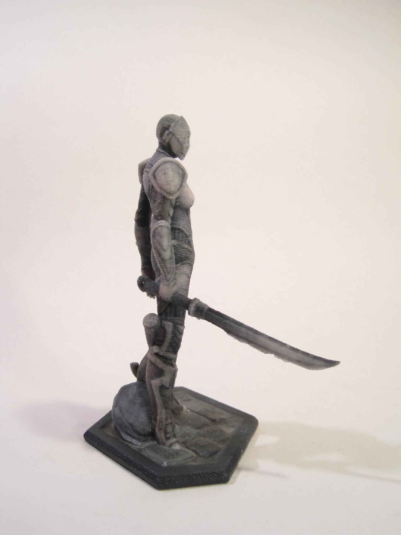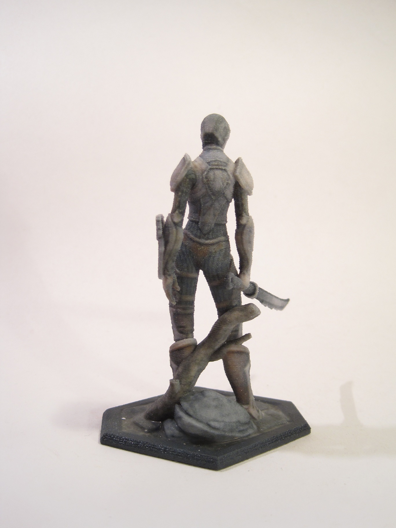 As with all of these figures, Isa is based on one of her many possible looks in Infinity Blade 3. In this version, I’ve dressed her up in the Shard Plate armor, Wraith helm, and Akkash arm guard, wielding Slicer. She is posed in the Poise pose (which sounds like the start of a tongue twister), standing roughly three and a half inches tall and with the usual zero articulation. The sculpt is mostly pretty well done keeping up with the slightly more modern look of her armor, the helmet in particular has an impressive level and sharpness of detail. As with the previous Isa figure, there’s a little stump of a tree on the stand, but I’m not sure why since this one doesn’t have the same structural concerns. The one pretty glaring issue is the sword. I guess the printing method has trouble forming hard straight edges but the sword is meant to be smooth, not the jagged oversized shiv it looks like she’s holding. I’m sure it’s nothing a careful application of a Dremel couldn’t fix, but I’m not sure exactly how fragile these are and don’t want to risk damaging it further. I just wish it hadn’t come that way in the first place. The colors are reasonably accurate if not a little washed out. Unfortunately, this figure continues the downward trend of needing an extra coat or two of varnish to bring out the colors a bit more and smooth out some of the rough sandpapery texture. Isa comes with no additional accessories as usual.