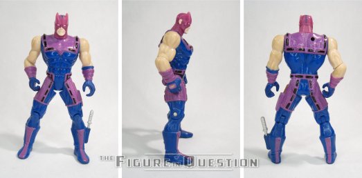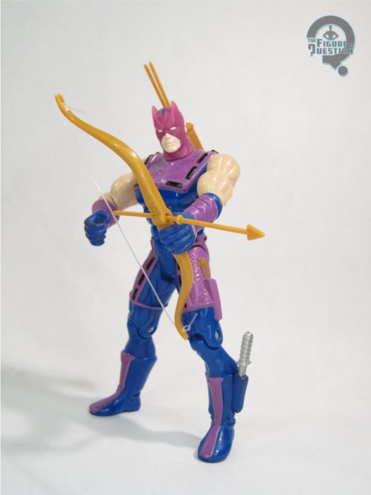 Hawkeye was released in Series 2 of the 90s Iron Man line, which was done to tie-in with the Iron Man cartoon of the time. Unsurprisingly, Hawkeye is based upon his appearance in that show, which in turn was based upon the design he had in the comics around the early 90s. It’s a tweak on his classic design, and it’s not too overly 90s, so it works. I do miss the buccaneer boots and loincloth, but oh well. The figure stands roughly 5 inches in height and sports 8 points of articulation, which is actually a little bit below the standard of the time. The lack of proper arm articulation is certainly odd, what with him being an archer and all, but he actually managed okay, thanks to the pose of his arms. The figure’s sculpt was wholly original to him. It’s not bad, especially for the time. The proportions are generally pretty good. The hands and feet are a little on the large side, and the shoulders are a little high-set. He’s also got some ridiculously defined musculature, but to be fair, that’s actually true to the show. The costume details are pretty well handled, with clean lines and some nice texture work on the purple parts. The head is pretty much spot on for the character, with just the right amount of cockiness in his
