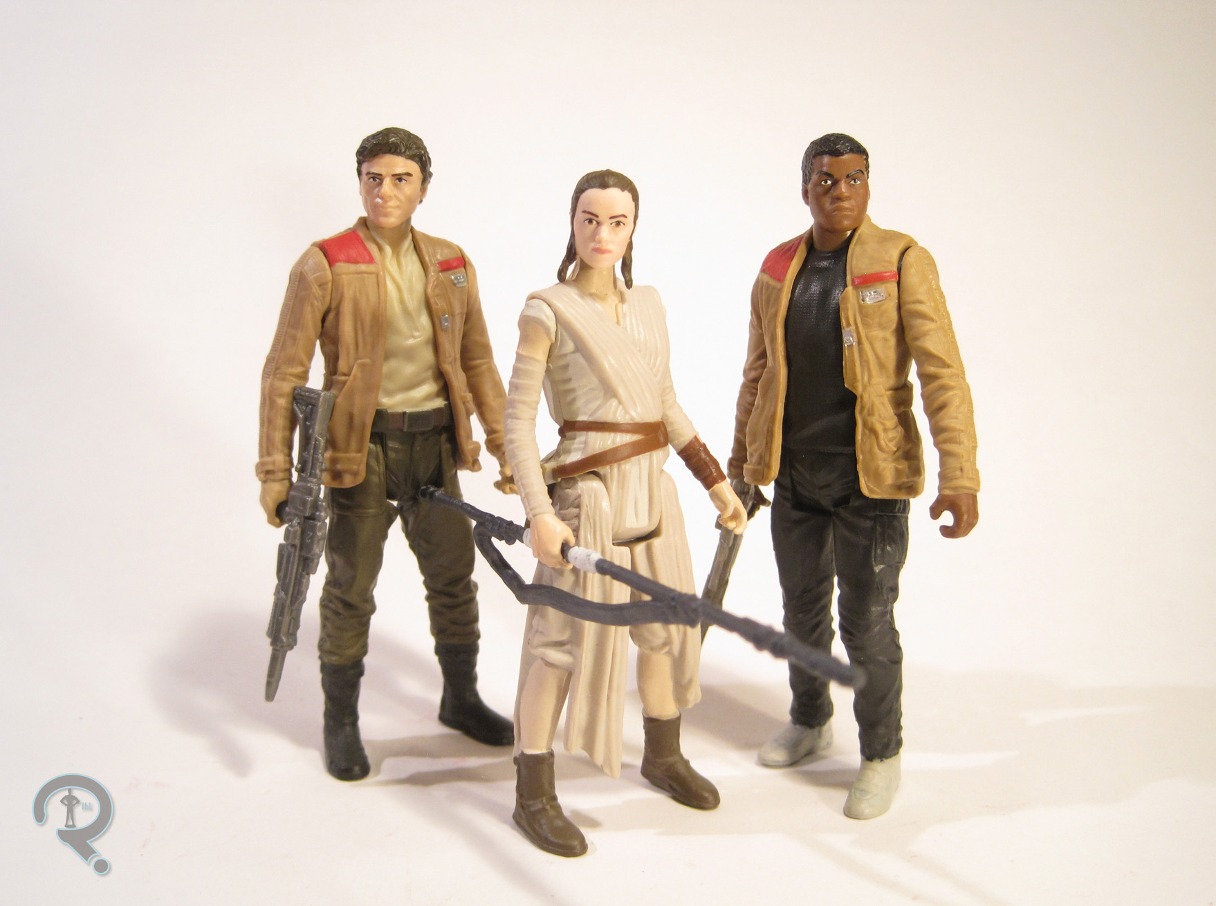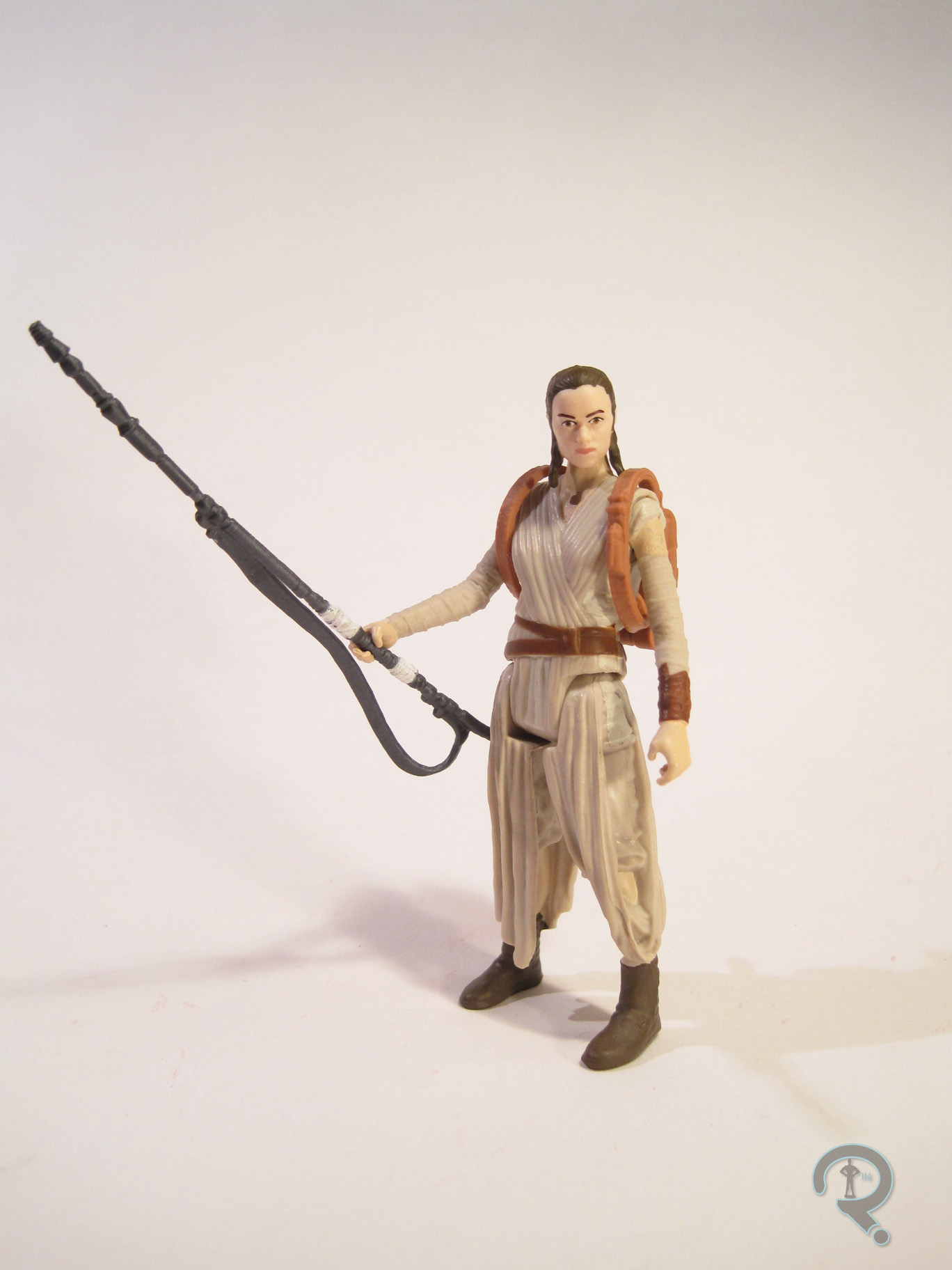 unnatural. The likeness on the head sculpt doesn’t seem quite as close as what we saw on Finn and Poe. I suppose there’s a little of Daisy Ridley in there, but when I look at the figure, all I can see is Kiera Knightley. Paint-wise, the figure makes out well enough. Paint is once again pretty sparse, but what’s there is fairly well applied. It’s rather hard to tell, but she does actually have two different tones to the over and underlying portions of the robes, which is a nice touch. She also has the cleanest hairline of the three figures I’ve looked at so far. Rey is packed with a staff, backpack, and another weird build-a…..thing. I wish she could hold the staff a little better and the random piece of whatever is still somewhat confusing, but it’s a nice enough accessory compliment.