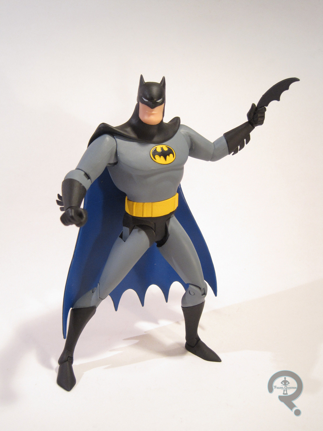 would have been nice. This figure makes out okay paint-wise. There’s the previously mentioned issue with the eyes, but other than that, the paint is pretty clean, and they seem to have done a pretty good job matching the colors from the show. Batman is packed with a B:TAS accurate batarang, a grappling hook, 7 hands (a pair of fists, a pair of basic grip, a pair for holding the batarang, and one with the grappling hook sculpted in place), and a display stand with his character design sheet printed on it. It’s not quite as much as was included with the last Batman, but it’s still a pretty impressive allotment.