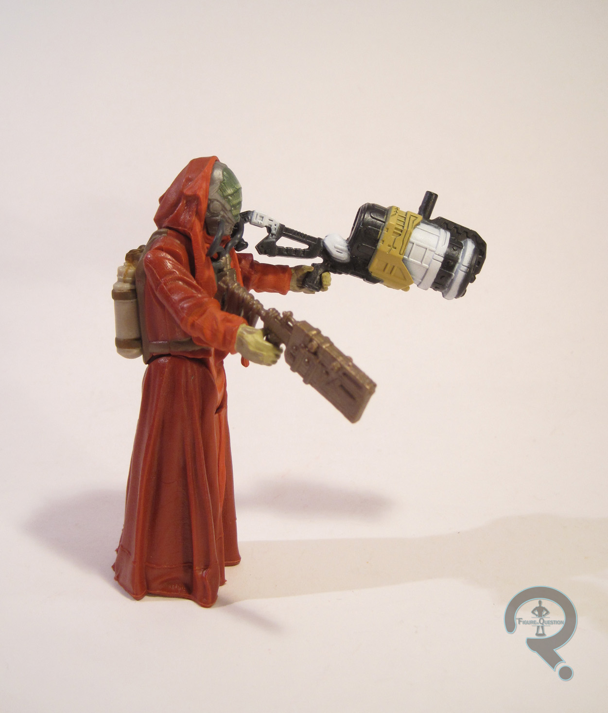 “A scavenger and trader who scours frontier worlds for riches, Sarco Plank must wear a specialized mask that keeps his native atmosphere circulating through his alien lungs.” So l it would appear that Sarco here is some sort of scavenger, possibly related to Rey in some way. Also, it should be noted that this guy was in some of the “Dark Side” reviewer packages, so he seems to be a bad guy. The figure stands about 4 inches tall (making him one of the taller guys in the line) and he has 5 (ish) points of articulation. There’s not much in the way of movement on the neck, but I’m pretty sure there’s still a joint there, just not a very useful one. Having no real reference for the character in the actual movie, I have the judge him purely by the quality of the sculpt. The quality is pretty good, mind you. This guy’s got a lot of cool textures and such, and the folds in his clothing look convincingly real. I also really like this guy’s helmet. It’s got a nice level of sleekness to it, with just the right amount of kitsch-y retro sci fi details thrown in. The multi-part visor in particular gives him a pretty unique look. His robes have been somewhat awkwardly cut into a pair of legs for articulation’s sake; it’s definitely goofy, but it calls back to the vintage Star Wars figures that did the same sort of thing with robed characters, so I don’t mind it too much. I’m not sure what’s going on with his hands, though. They’re kind of…mushy? My best guess would be they’re supposed to be hairy. Sarco actually gets a slightly more intricate paint job than a lot of the other figures in this scale. His helmet has a gradient of colors, making it look semi-transparent, and the robes have a nice variety of orang-y reds, as well as a slight wash to give him some extra depth. The apparatus on his chest even has the slightest bit of grime, which is a nice touch. Sarco is packed with a fairly neat looking gun (which could definitely benefit from some paint), as well as a piece to one of the build-a-things. Fortunately, his build-a-thing piece is actually another gun, so it adds a little more value, instead of being a meaningless piece of plastic like all the others.
