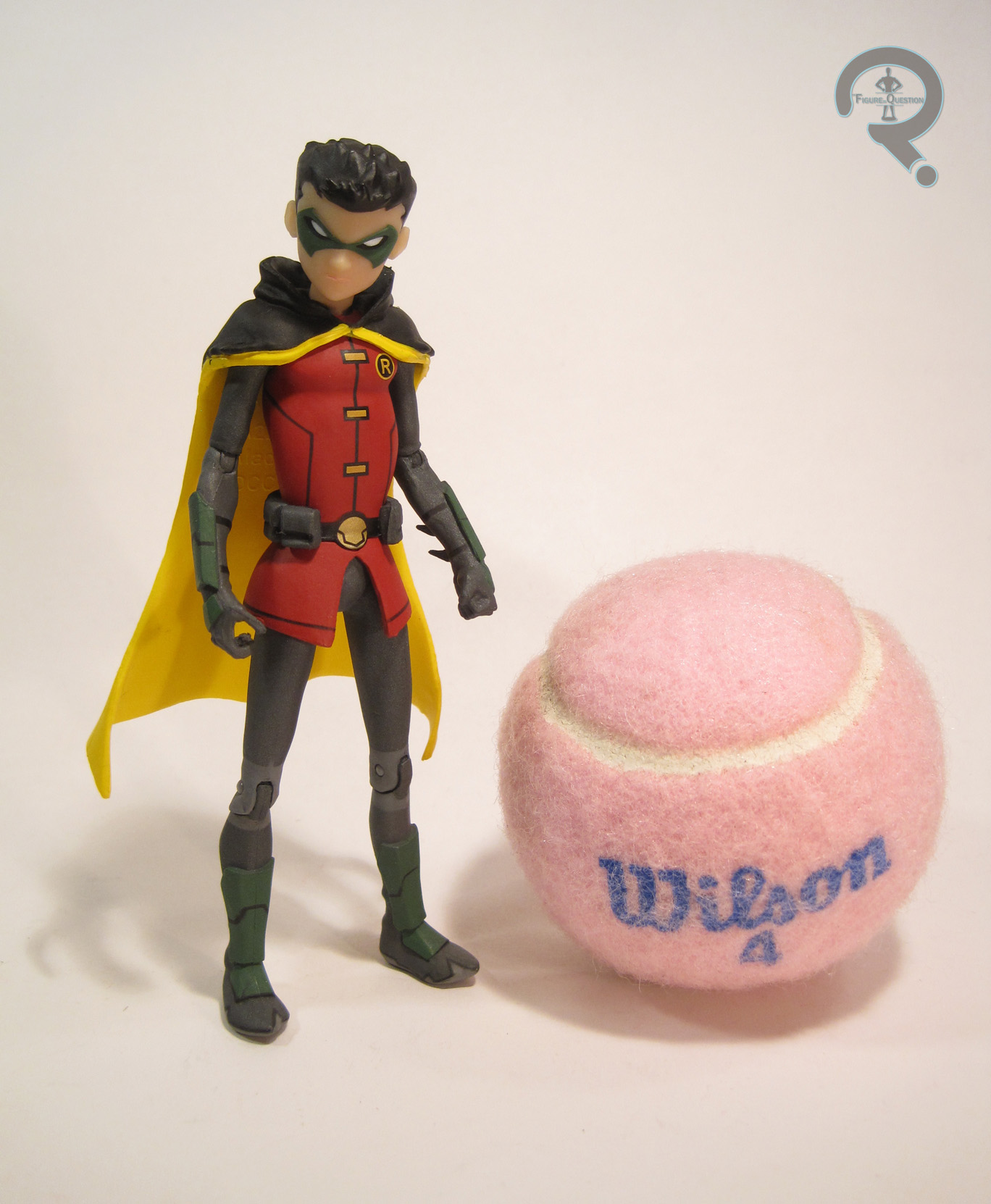 I got this figure from my local comic book store, Cosmic Comix, during the annual “Biggest Sale of theYear” event. I picked him up in part because he was reasonably cheap, but also because I kind of like Damian, and I didn’t yet own a figure of him. Despite being the son of Batman, and serving as Robin for a few years, the figures of Damian Wayne are rather limited. To date, he’s had five, counting this one. DC Direct made two: one was from before he was Robin, and the other, while a nice figure, had a hefty aftermarket price. The next figure was from Mattel, and was….how do I put this? Abysmal. Like, they gave him bulging muscles and stuff. That left me two options: the super cartoony Lil’ Gotham version, or this one. I think I chose well. This figure’s got a handful of drawbacks, but the overall result is pretty good.