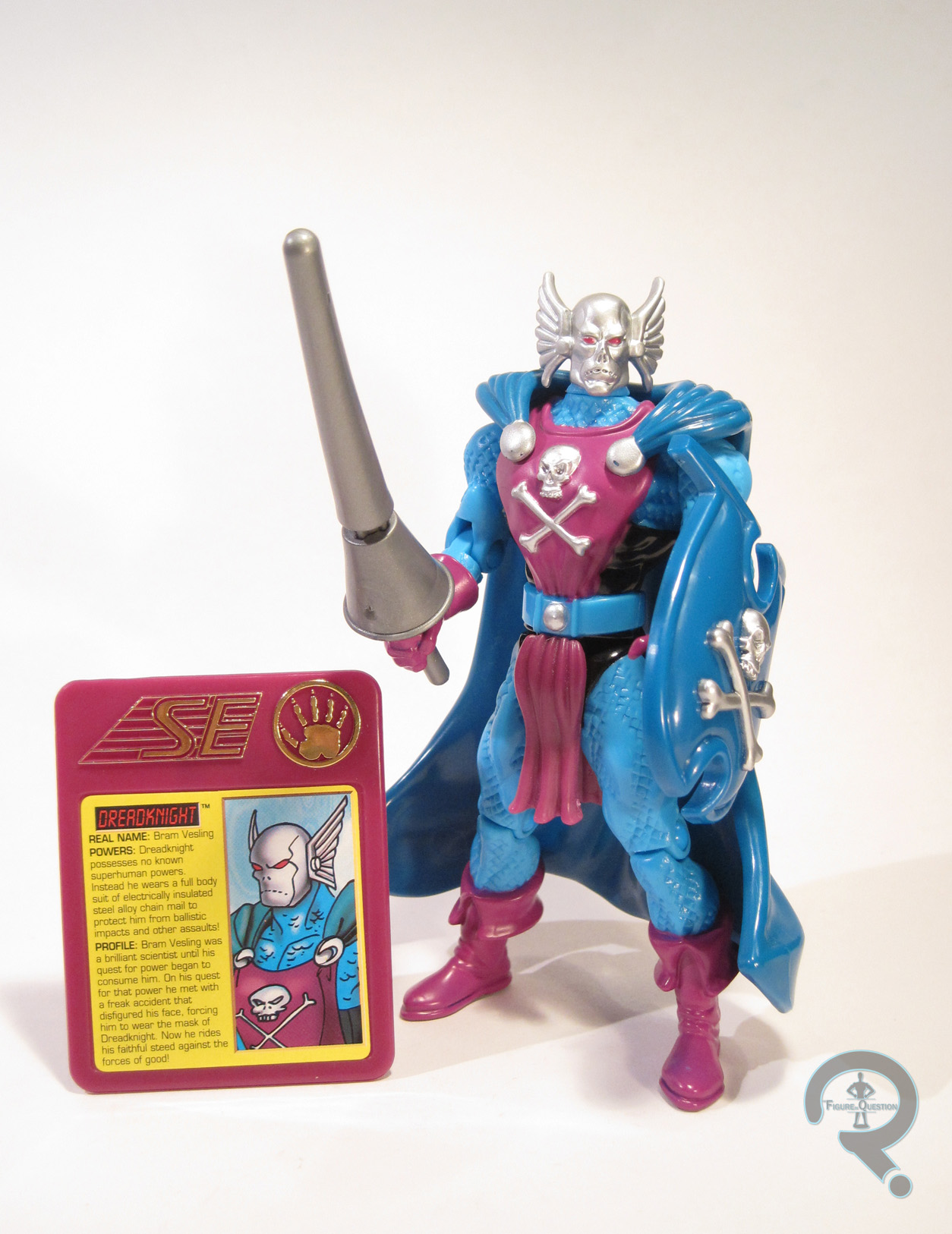 Dreadknight was released in the third series of Toy Biz’s Iron Man line from the 90s. He was based on the character’s appearance in the show, which was in turn based on his appearance in the comics, which was unchanged. The figure stands 5 ¼ inches tall and has 9 points of articulation. Dreadknight’s sculpt was unique to him at the time, though most of the body sculpt would be re-used later down the line as a Black Knight figure. Generally speaking, it’s a pretty decent sculpt, and it’s on par with the rest of the line. Some of the musculature is a little on the large side, the arms are somewhat stubby, and he’s got a bit of a pinhead going on, but he looks pretty good as a whole. The occasional hint of chainmail detailing is an interesting way of handling it, but it works. Plus, the overlying clothing all has some nice folds and movement to it. It may be a bit small, but I do like the way his head turned out; very menacing. His cape is a separate removable piece. It’s pretty well sculpted, but it’s rather thick and heavy, and it doesn’t stay in place very well. Dreadknight has the misfortune of being saddled with a pretty horrific color scheme; the light blue and magenta really don’t go together. The figure accurately captures the colors, mind you, but they remain terrible. His paintwork is alright, but nothing fantastic. There’s a fair bit of bleed over on the edges of the magenta, which is certainly distracting. Dreadknight included a lance, with a weird, hard to use missile launching feature, as well as a shield, and a badge with his bio on it.