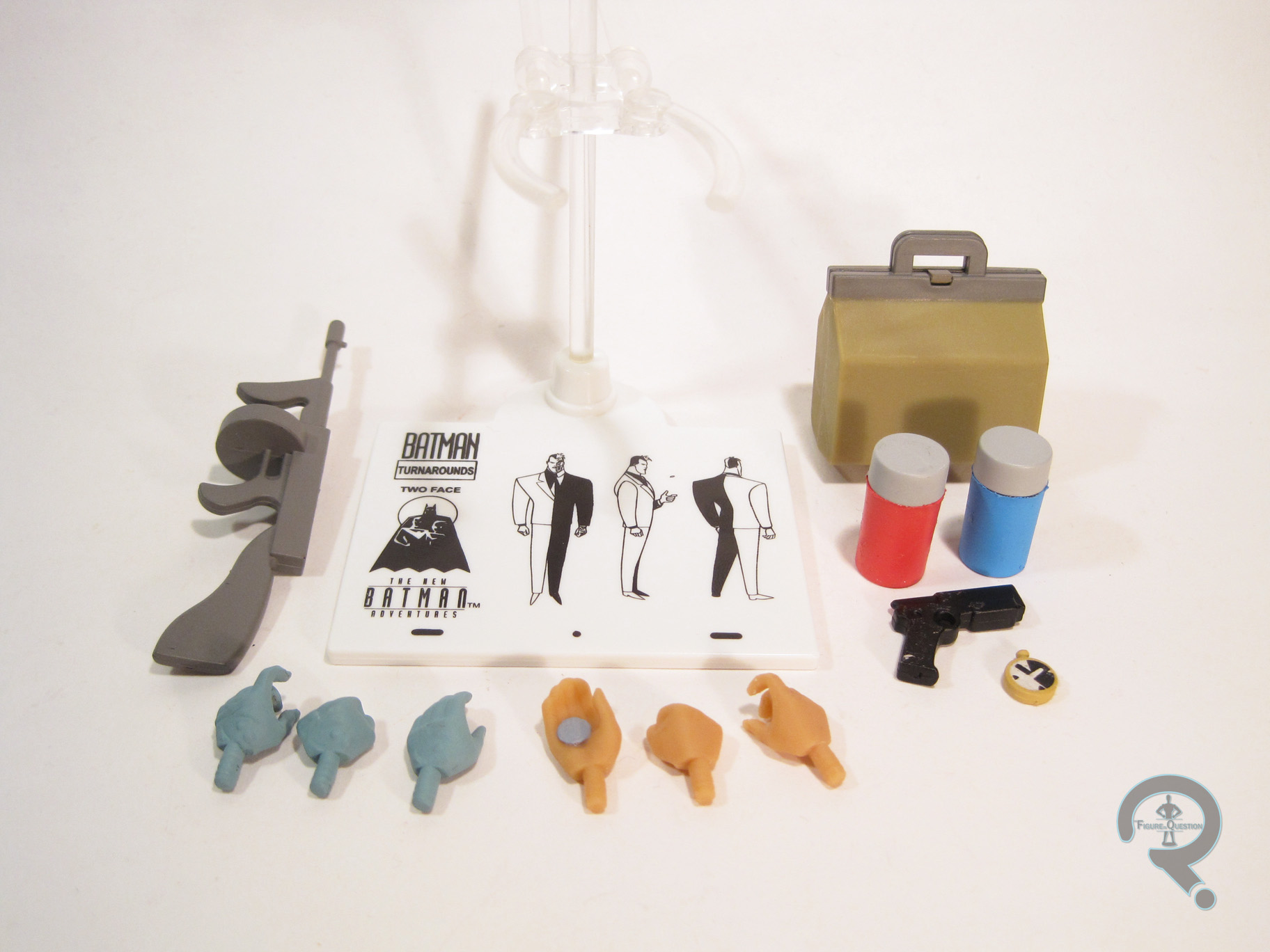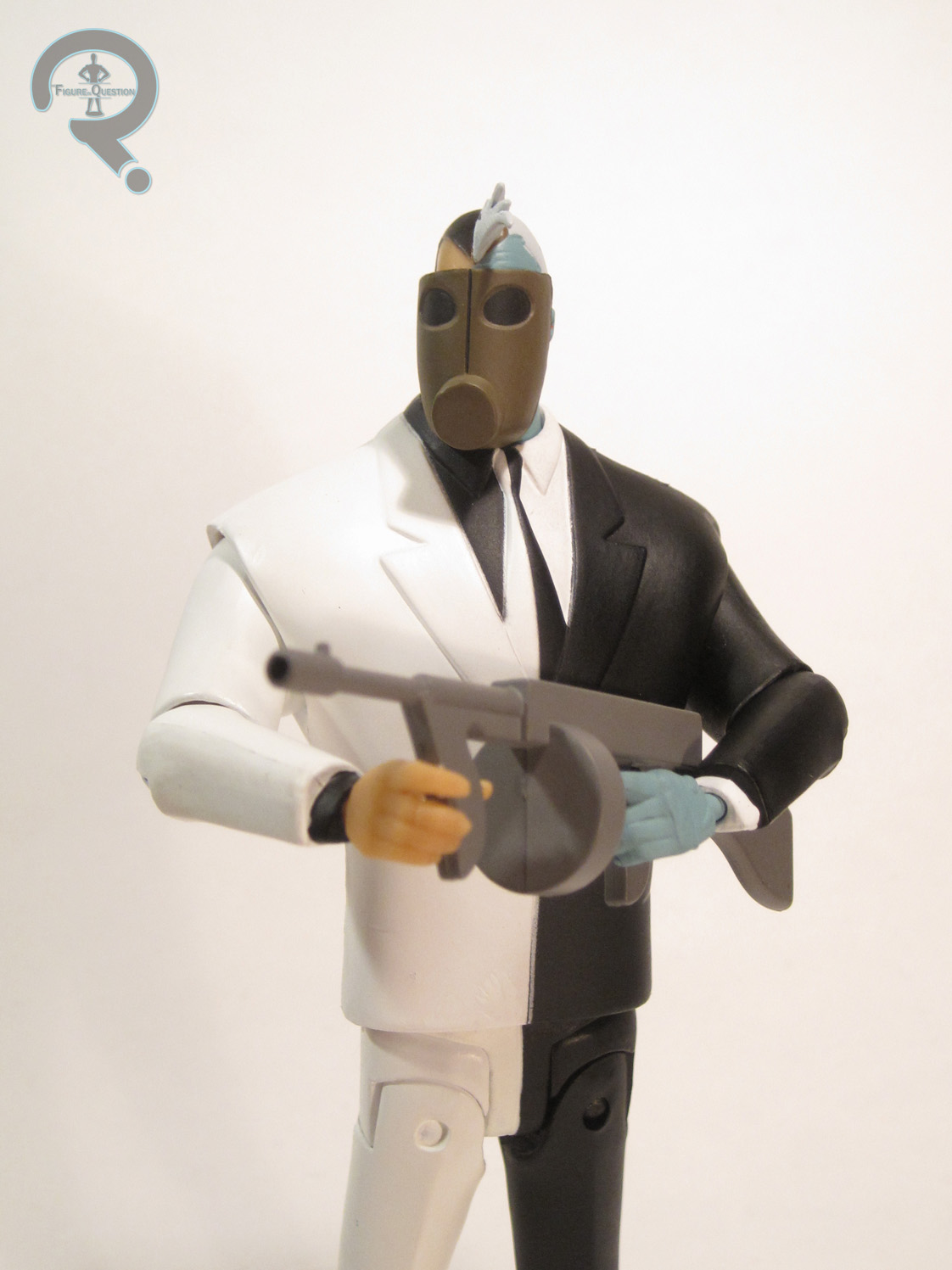 the changeover from white to black on the suit, and the white paint gets kind of gloppy in a few places. But, the colors are pretty good matches, and he looks perfectly fine when viewed from a small ways back. Two-Face is packed with a handgun, a tommy gun, a pocket watch, a bag, two vials of chemicals in red and blue, a gas mask, three pairs of hands (trigger finger, fists, and open palm), and a display stand. Several of these (the mask, bag, chemicals, and watch) are specific to “Sins of the Father,” which is cool. I do wish the chemicals were more than solid colors, but oh well. Also, the relaxed right hand has a sculpted coin, since you can’t very well have Two-Face without it!