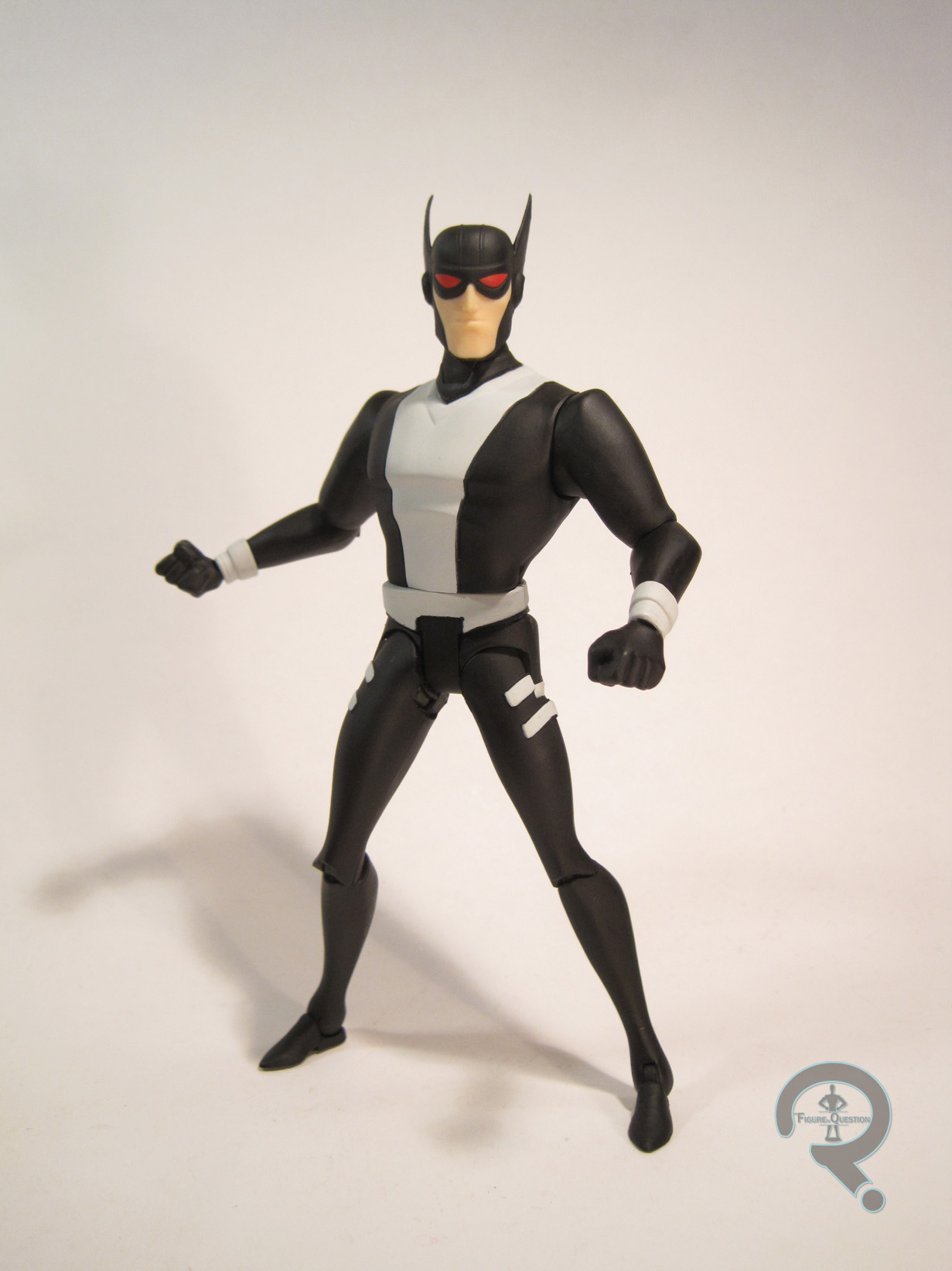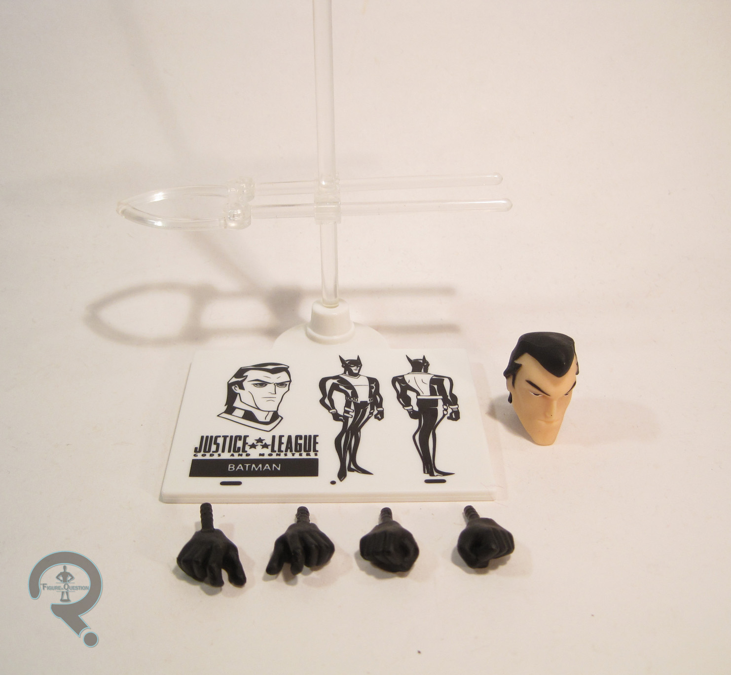fairly basic; it’s just black and off-white, with some red thrown in for good measure. The overall application is pretty good; some of the edges are a little fuzzy, and there’s some bleed over here and there, but it’s mostly pretty clean. Batman is packed with an extra unmasked head, two pairs of hands (in fists and… some sort of weird, pseudo-grip sort of pose?), and a display stand with his control art on it. He’s a bit on the light side when compared to other animated releases, but it’s a decent enough selection, I suppose.