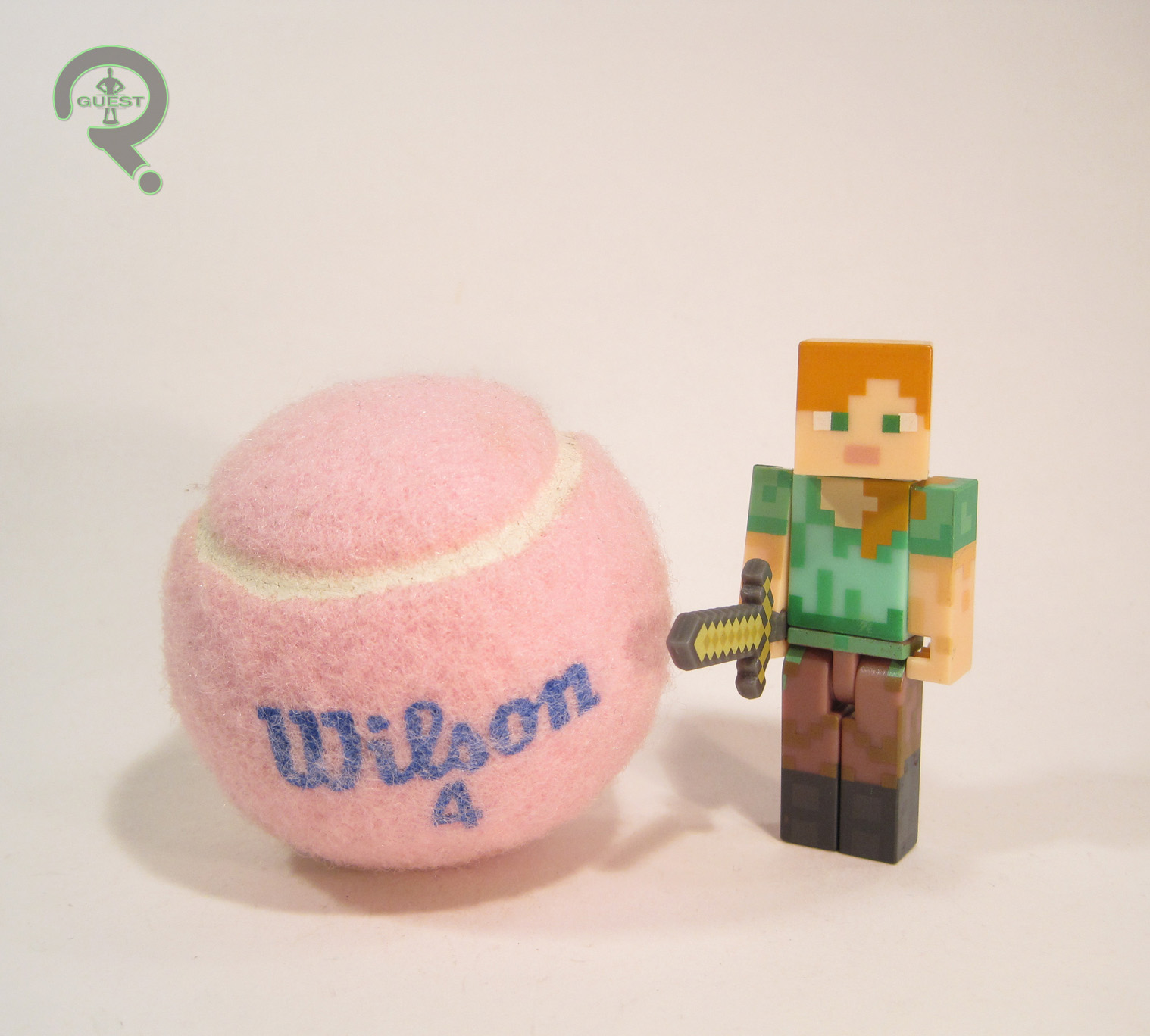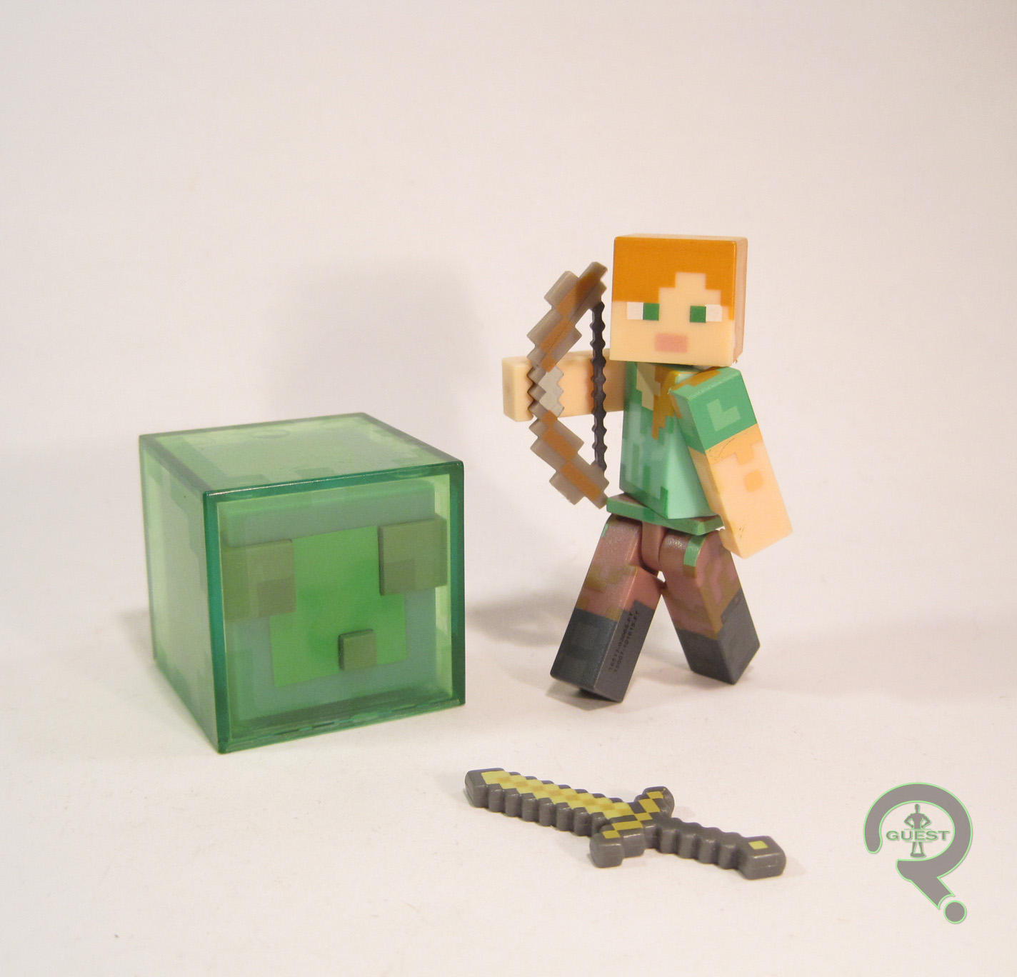 Alex is, as stated before, the female player character in the wildly popular game, Minecraft. She is a part of the third series of Minecraft figures. She stands approximately 3 inches tall and has 6 points of articulation. She is a very blocky figure, which follows the game’s overall aesthetic. Her paint work is exceptionally detailed, but there are some fuzzy edges along the facial features, and there’s some pretty noticeable slop on both of her arms, but especially the left one. The orange of her hair is nice and vibrant on top of her head, but when painted onto the body, it seems to have been applied overtop the green of her shirt and causes the color to look really dingy and just… off. From a distance she looks awesome, but up close she gets a little disappointing. I don’t care that much though, because I’m really into her as a character anyway. For her accessories, she comes with a bow, a gold sword, and a Slime. The box looks pretty cool, but the edges of the paintwork are not clean, and it’s a little tricky to get her to hold it in a secure fashion. The sword is pretty nice, the paintwork is super neat and the sword is immediately identifiable as the material it is made of in the game. The Slime is a cool item to receive, replacing the normal building block that comes with the figures in this line. It also looks really cool, a 1.5 inch cube made of transparent green plastic with different shades of green plastic on the inside to provide the detailing. It leads a super clean likeness to the Slimes in the game, and a really cool looking piece. My one complaint about the Slime character is that the color green for the transparent plastic is a rather dark green, which is inaccurate to the game and causes the detailing inside to be difficult to see. If the transparent plastic was a lighter green like it is in the game, I think the details inside the Slime would be more vivid and impressive.