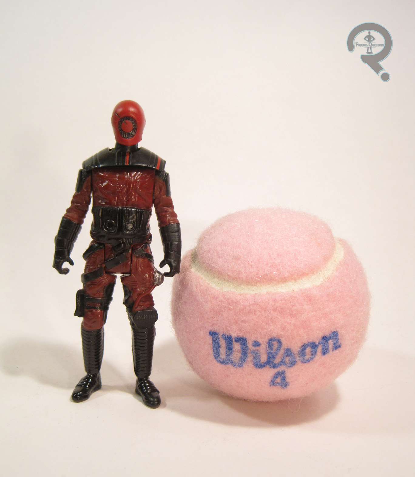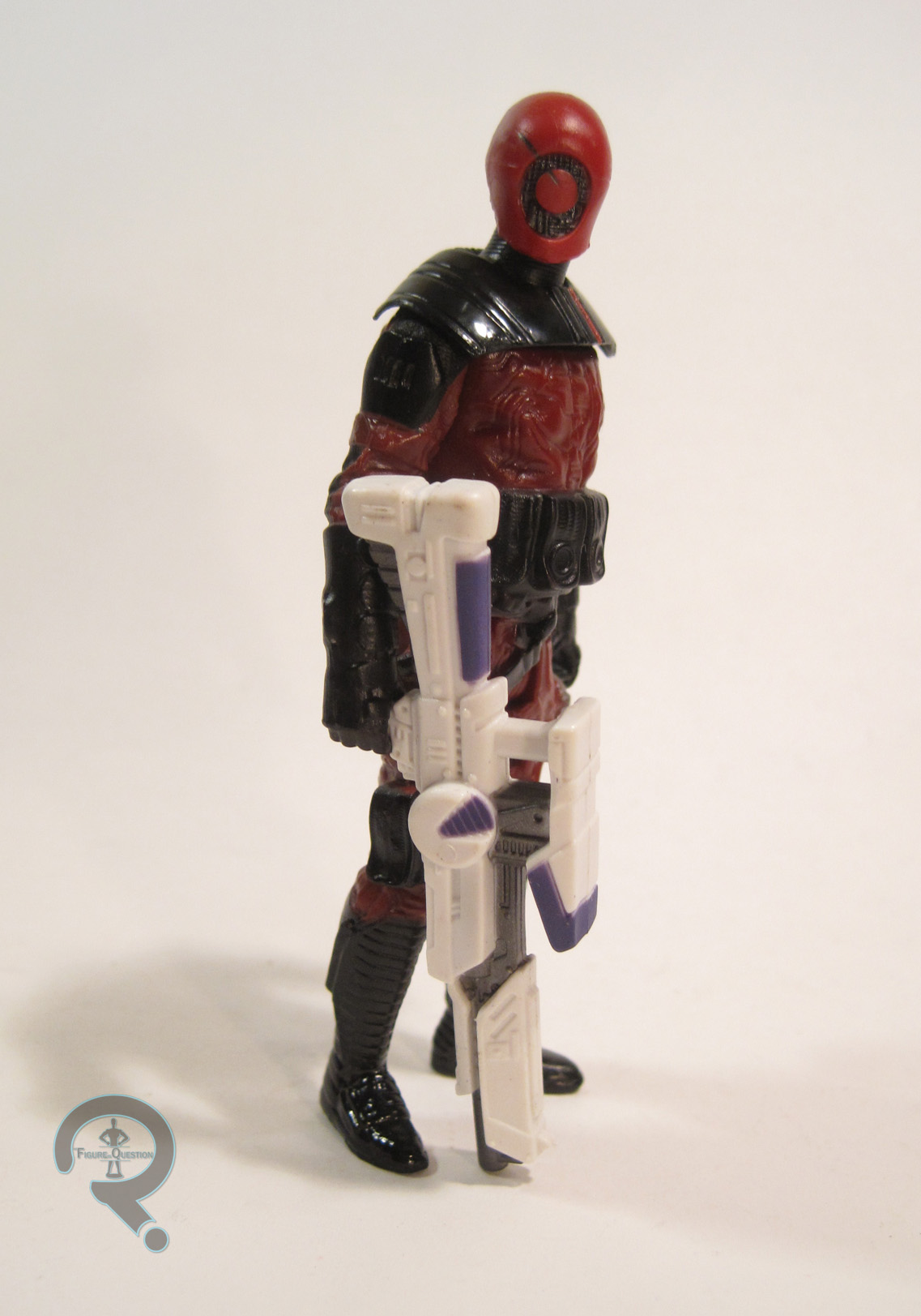 The Guavian Enforcer is part of the smaller-scale Star Wars: The Force Awakens line. He’s from the second assortment of the “Space” subset of the line (the same one as General Hux). The figure is 3 ¾ inches tall and he has 5 points of articulation. The Guavian’s sculpt is new to this particular figure, but it in many ways feels like a simple scale-down of the Black Series version of the character. It’s not, obviously, since that figure had a totally different articulation scheme, and the details were just the slightest bit different, but they’re pretty close. Which is good really, since it’s supposed to be the same design. The sculpt is definitely high-quality. The proportions are pretty great, and there’s a ton of texture and small detail work. The separate parts of the costume could perhaps stand to be a little more defined, but at this scale, the work is acceptable. The Guavian’s paint work is fairly straightforward; he’s molded in red, with paint for the black and silver bits. The application is passable, if not anything amazing. He lacks a lot of the more subtle work from the larger scale figure, which is a shame, but reasonable at the smaller scale, I suppose. The figure is packed with one of the two guns packed with the larger Enforcer (the shotgun looking one), as well as a piece the Build-A-Thingy for this subset. On the plus side, this one’s a giant gun, so it can actually be used as an extra piece for the figure, if you don’t plan to finish building the whatever it is.