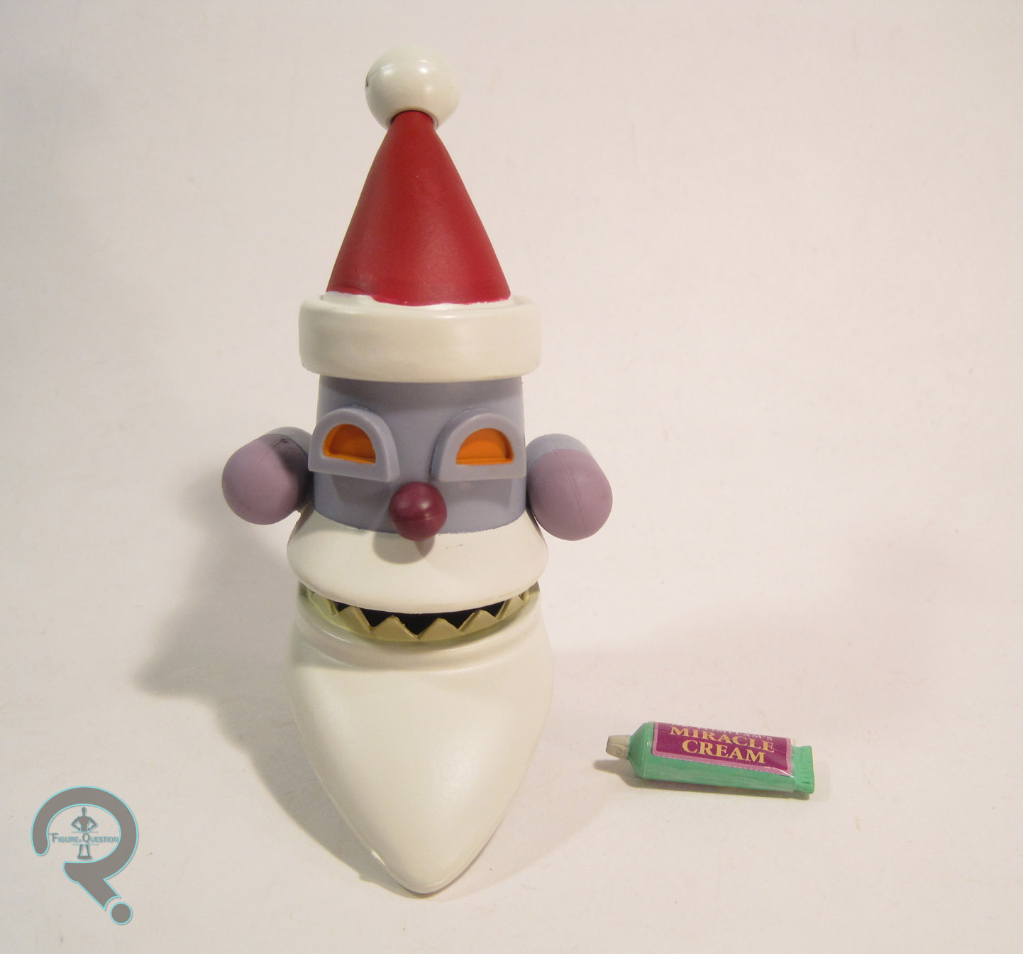 dimensions. It’s not a perfect translation, but it’s close enough that you’ll really only notice the issues when doing a direct comparison. The paint on this figure is pretty well done for the most part. There are some spots with some minor bleed over, but the basic application is very clean, and he looks really sharp. Captain Yesterday includes two accessories: a tube of Dr. Flimflam’s Miracle Cream (which is what gave Fry his powers), and the head of Robot Santa.