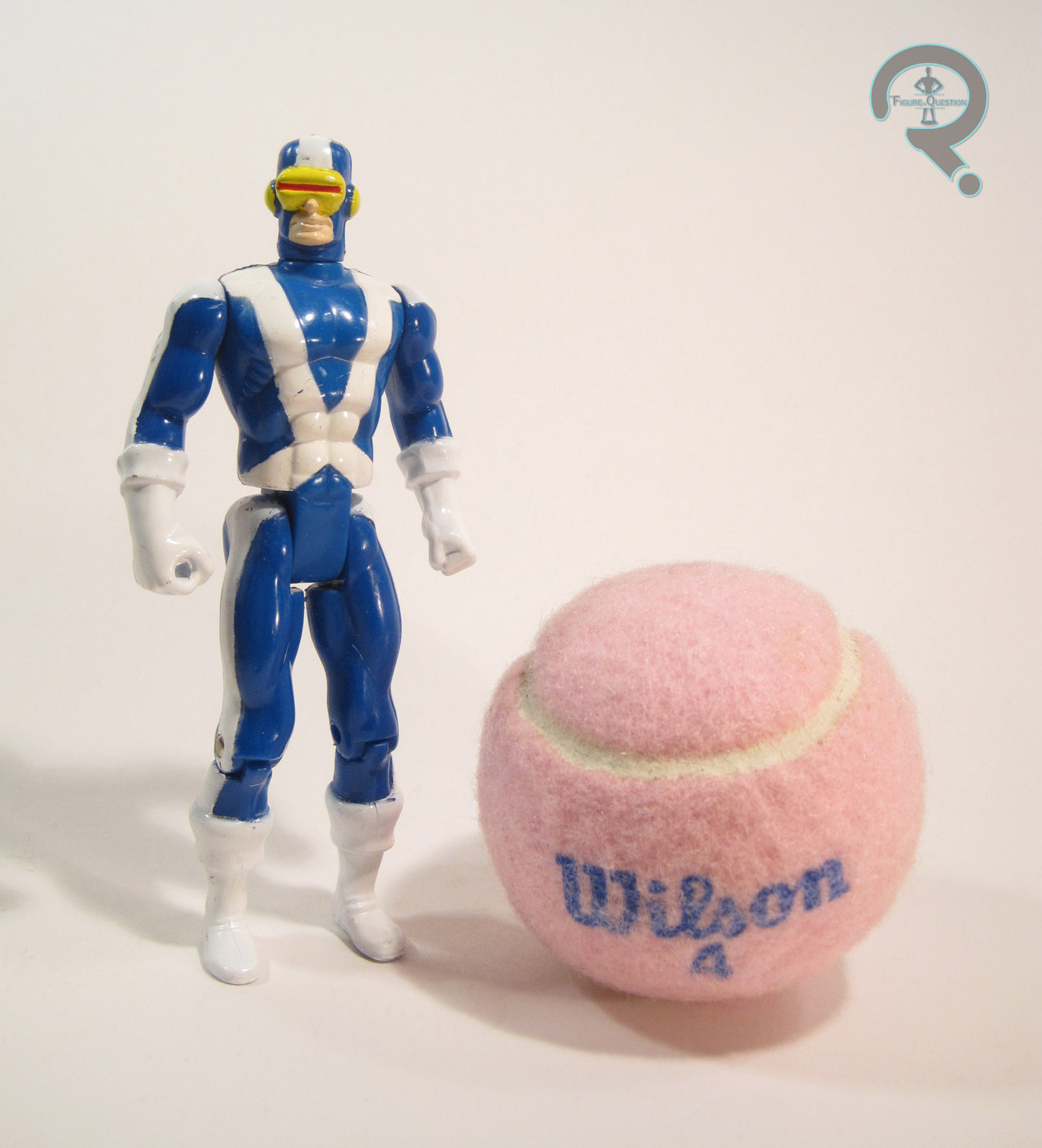Cyclops was released in the first (and only) series of Marvel Electronic Talking Super Heroes and X-Men. Yes, the “and X-Men” is actually on the card. Guess they don’t count as Super Heroes. The assortment was released in 1991, alongside the first series of the X-Men line and Series 1 and 2 of the Marvel Super Heroes line. As such, the talking figures have a fair bit in common with their non-talking variations from those lines. In fact, the prototypes on the packaging are just the regular release figures with the talking boxes attached. Cyclops has a lot in common with the X-Men Series 1 Cyclops, but he actually has a few notable differences. The figure stands 5 inches tall and has 7 points of articulation. While he loses the elbow movement from the X-Men Cyclops, he also loses the light-up feature, meaning he gets neck articulation. That would be a feature unique to this figure for several years. Aside from the slight changes in articulation, the sculpt is more or less the same. There’s no denying that this is a slightly dated sculpt, but it’s a step up from what Mattel offered 7 years before. Honestly, I think the neck movement does a lot to help make the sculpt look a little less unnatural, since the head looks far less stiff. The paint is, in theory, the same as that of the X-Factor version of the Series 1 Cyclops. In theory. In practice it’s noticeably sloppier. Like, a lot sloppier. From afar, he’s not atrocious, and I don’t think the figure’s ruined, but there’s no denying that this guy isn’t Toy Biz’s finest work. The talking portion of this figure is handled via a giant red backpack, which plugs right into his back (and stays there really securely. I almost thought it wasn’t coming back off). The figure has three different sounds: “Let’s Go, X-Men,” “Optic Blast Fire,” and a laser blast sound effect. The sound quality is a little muffled, but otherwise not bad. In addition to the talking box, he also includes a gun because… reasons? Maybe it’s because he’s the father of Cable? Yeah, I don’t know, but there it is.