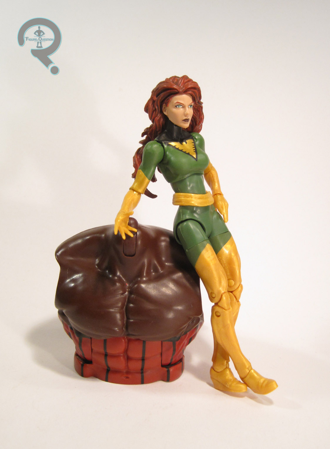 Mockingbird figure, but the actual body proper is making its debut with the Juggernaut series. It’s a very strong sculpt, probably Hasbro’s best basic female body so far. The legs are just a touch on the long side, but not horribly so. Also, my figure has a bit of trouble standing, but I don’t know if that’s true across the board. In addition to the new body, Jean re-uses the open gesture hands from Storm and Wasp, and the sash from Iron Fist, as well as an all-new head sculpt. I wasn’t sold on the head sculpt in the initial shots, but I have to say, I really like how it turned out now that I’ve seen it in person. It’s still a touch too gaunt for my ideal Jean, but it’s certainly not bad. The paintwork on Jean is quite nice. While she hasn’t got the fun metallic scheme of the last Phoenix, I think that the flatter color scheme still works pretty well. Everything is pretty cleanly handled, especially the face, which is possibly the sharpest work I’ve seen on a Hasbro Legends figure. Phoenix has no accessories of her own, but she does include the torso of the Build-A-Figure Juggernaut.