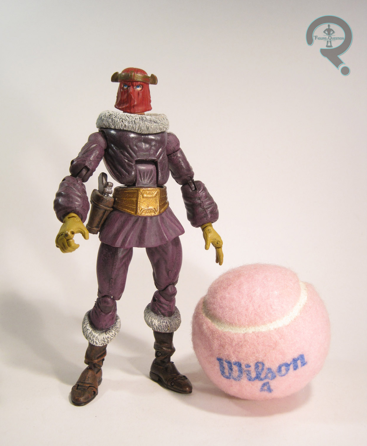Baron Zemo was released in Series 14 of Toy Biz’s Marvel Legends, which was also commonly known as the “Mojo Series” after its Build-A-Figure. It was the penultimate series of the line, and ended up being rushed into production so that Toy Biz could get it out before passing the license off to Hasbro. The figure stands a little over 6 inches tall and he has 36 points of articulation. As with so many of Toy Biz’s Legends figures, there was a definite priority placed on the articulation over the integrity of the sculpt on this guy. For some, that was less of an issue, but on this guy? Oh boy, it’s pretty bad. Now, admittedly, there were some production things that made some problems crop up that weren’t on the initial prototype (mostly the neck), but this guy was always going to look sort of…weird. His shape is vaguely human, I guess. The hands and feet were definitely too large, the neck too long, the waist both too high and too thin, and the limbs too skinny. His clothes are both uncomfortably clingy and oddly loose, in a way that he would have to have them sewn on him that way. It just doesn’t make a whole lot of sense. I mean, if you take some of the pieces individually, there’s some good stuff there. The head is pretty good, and captures his comics design pretty well. The boots are also pretty nice, especially the fur lining. The holster’s okay, but the gun’s non removable, which is always very frustrating. Other than that, though, it’s pretty goofy. Did no one stand back, look at this guy, and go “that looks nothing like a human?” Because I did that. On top of the very questionable sculpt, there were also some major quality control issues on this series in particular. Most of the figures, Zemo included, were saddled with incredibly rubbery joints. It makes getting him to stand quite difficult, and leaves him always looking the slightest bit deflated. The paintwork on this guy is probably his strongest aspect. It’s still not perfect; the gold pieces in particular are a real mess, and the washes can be rather hit and miss. However, it’s still pretty passable. Zemo included the head and upper torso of Mojo, as well as a weird staff thing. The staff is kind of goofy; there’s a hole in the handle and a corresponding peg in his right hand, but he never holds it in a particularly convincing way.