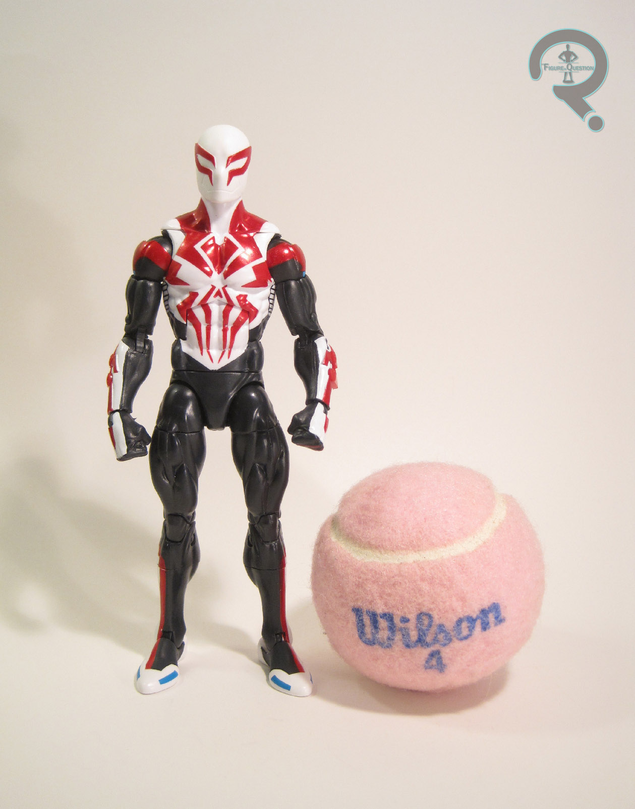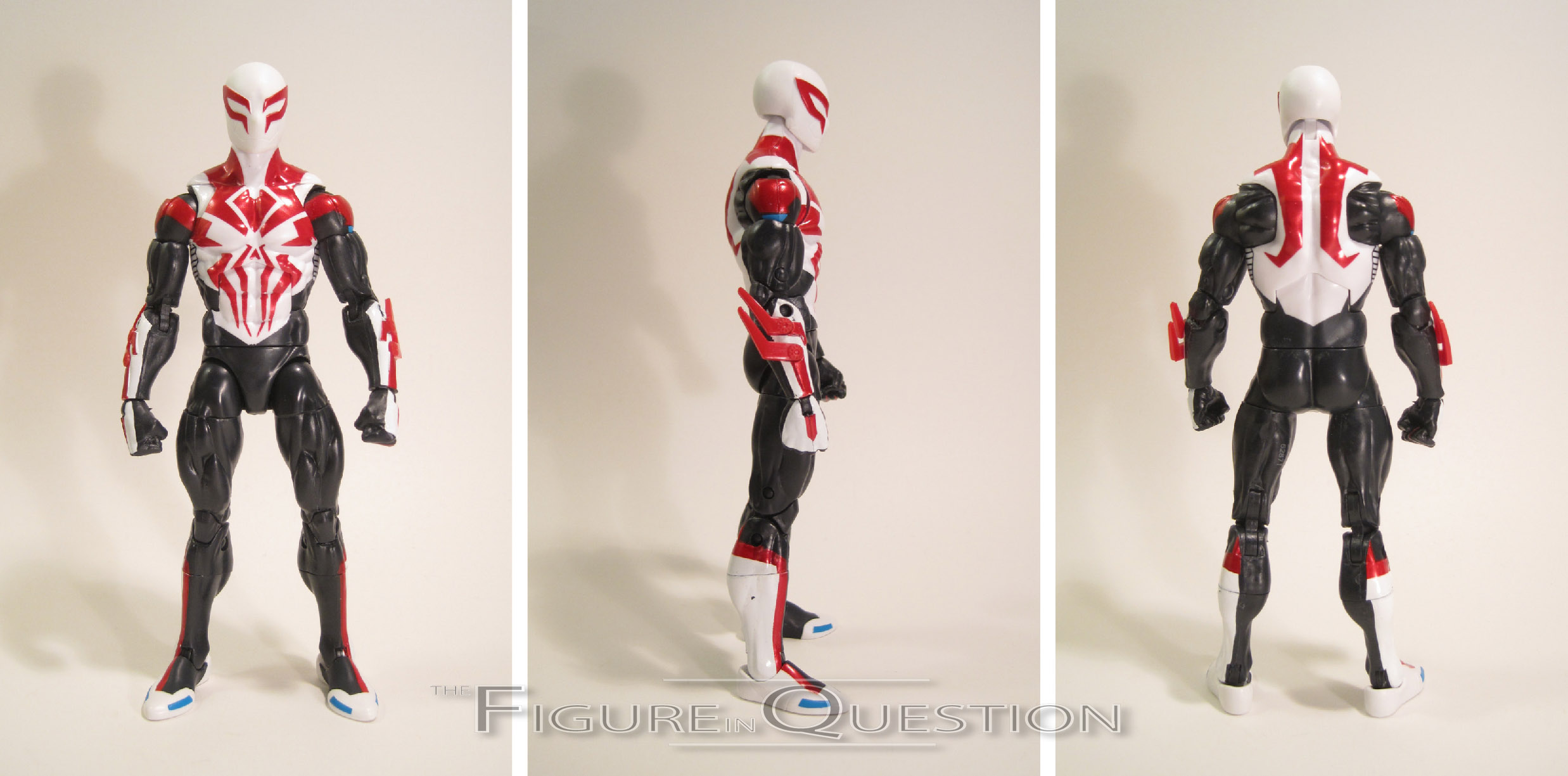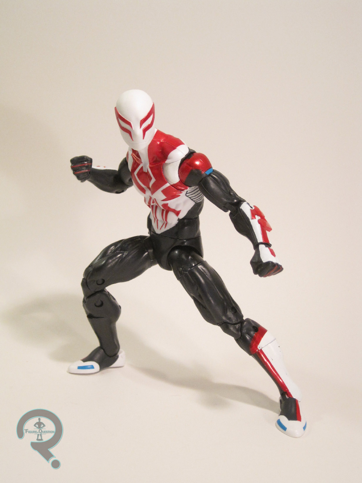 Spider-Man 2099 is figure 2 in the Sandman Series of Marvel Legends. His official name is “Multiverse Spider-Men,” a name he shares with the previously reviewed Spider-UK. This guy is based on 2099’s latest costume design, which he got with the launch of his “All-New, All-Different” title. It’s not a bad look, but I’ve still got a soft spot for the old one. I feel like this one’s too short on blue. Regardless, it’s his new main design, so it’s only fair it see action figure form. The figure stands about 6 1/4 inches tall and he has 34 points of articulation. The last 2099 was built on the Pizza Spidey body, which was fine for a classic version of the character, but these day’s Miguel’s looking a bit more robust, so this figure debuted an all-new base body. Thanks to the weird distribution of this series, I’ve already reviewed, via Sunfire. I liked it there and I like it here. I’m really happy to have a middle ground between Bucky Cap and Pizza Spidey, and this new base is a great balance of sculpting and movement. Those shoulder joints are absolutely fantastic, and feel more sturdy than the Pizza Spidey joints, which always give me pause. In a lot of ways, this body
