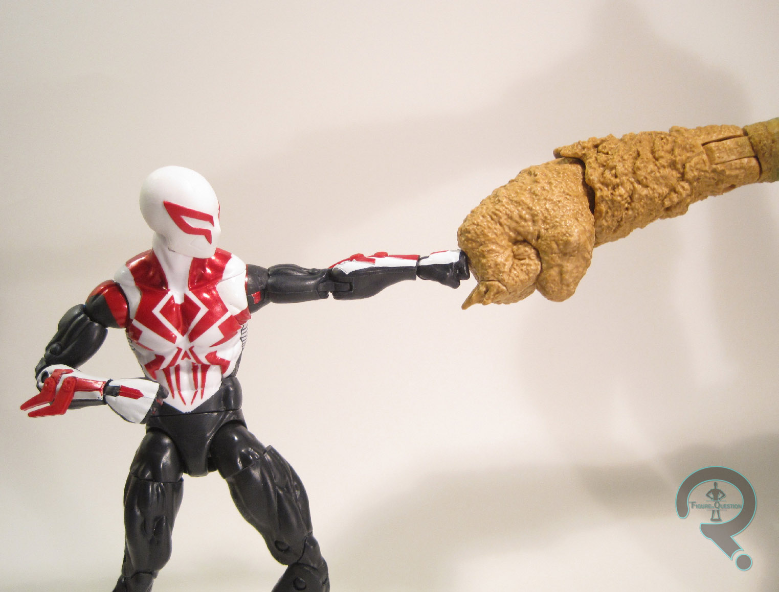 feels like the true successor to the old Bullseye body, and that’s a definite compliment. 2099 gets a unique head, forearms, and feet, all of which are great fits for the body. The head in particular is really nice; it’s a very clean, sharp sculpt, and I really appreciate how well you can make out Miguel’s face under the mask. That’s some really great detailing. The forearms are decent enough, though the spikes are a little on the soft side. The feet being unique is a bit strange if I’m hones. They’re not really that different than the ones on Sunfire, just with some extra etched-in details. I’m certainly not complaining. The paint on 2099 is pretty good, though not without some minor issues. There’s a little bit of bleed over here and there, and the white paint on his legs seems a bit prone to chipping. On the plus side, the metallic red they’ve used looks really, really slick, rivaling the last figure’s metallic blue in terms of coolness factor. 2099 includes no accessories of his own. Some extra hands showing off his talons would have been cool, or even an unmasked head, but he was technically an all-new sculpt, so I guess it’s excusable. Oh well. He does, however, include the right arm of the Sandman BAF.