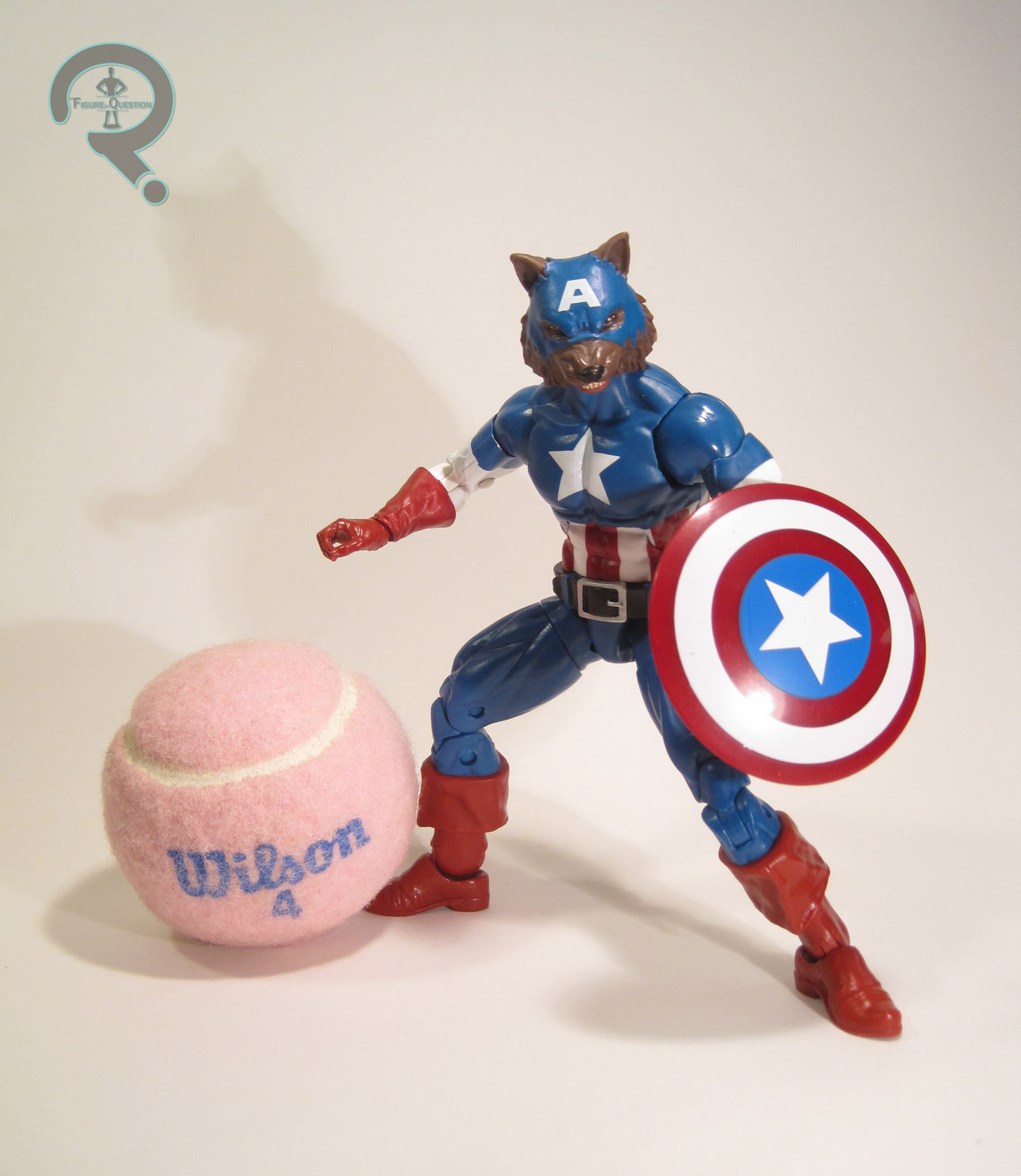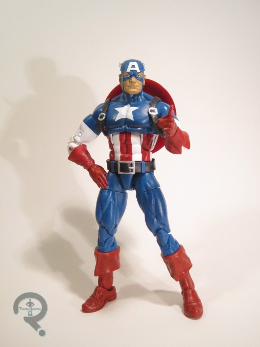 Captain America is the first figure in the Red Onslaught Series of Marvel Legends, which was the first of the three vaguely Captain America: Civil War-themed series released last year. I looked at a handful of figures from the series back when they were still new, but never got around to this guy, mostly for the aforementioned “slip-up” reasons. This figure is, or is at least intended to be, an updated classic Captain America, which was a nice thought, given that the last actual classic Cap before this one was the Face Off version from Toy Biz. He stands a little over 6 1/2 inches tall and has 32 points of articulation. Cap is built on the Reaper body, which most of us had figured would be the case as soon as the Reaper body showed up. I’m not sure it’s the best base for the character; it seems a little chunky for him. That being said, it’s certainly an improvement on the body that was previously being used for Cap, so that’s a plus. Cap got unique pieces for his head, forearms, shoulder straps, belt, and boots (the forearms, belt, and boots would later be re-used for Red Guardian). The majority of the pieces are decent work, and they fit well on the body. He really, really could have used at least one fist, but that’s minor. The first major nit I have with the figure is the straps on the shoulders; previous pieces have always been done as a single harness piece, but for some reason this time Hasbro opted to go with two separate pieces. The issue is that they don’t have anything to connect to, nor do they have the tension that would be brought by connecting to each other, so the end result is that they’re pretty much impossible to keep in place. They just fall right off the arms. Just getting the one photo with them was a nightmare. The second major nit, and the primary reason I held off on getting this figure for so long is the head sculpt. I’ve never been happy with the Hasbro Legends take on Steve Rogers, and this figure really exhibits the worst of that, even more so than prior figures. His head looks thuggish and angry, and just all-around ugly, which is hardly how I think of Cap. He takes the squared off, scowlly “Hasbro Face” that I so despise and dials it up to 11. On top of that, the head is super, super wide, like it’s been stepped on or something, and is in general just way too large for this body. It’s almost like they scaled it to the Hyperion. I wish I had something nice to say about this head, but I really, really hate it. The paint on this guy is okay, but hardly Hasbro’s best. It’s a bit weird stepping back a year to just before they started really making the strides in paint quality. He’s okay, but there’s some noticeable slop, especially on the white sections. Ironically, the head gets probably the best work, but it’s not enough to save it. Cap is packed with his mighty shield (which is the same mold used for Taskmaster, Red Guardian, and Vance), a pair of gripping hands, a left hand that’s pointing, a right hands that flat, an extra Cap Wolf head (which is probably the coolest included piece, and at least gives the figure *some* value), and the back-thingy of Red Onslaught.