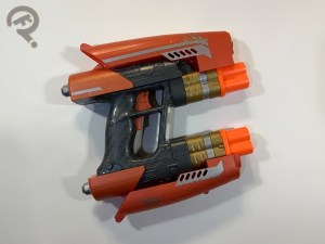 The Star-Lord Quad Blaster was released in 2014 as a Marvel tie-in product to coincide with the release of the first GotG movie. Interestingly, there is no Nerf branding anywhere on the blaster, but just a quick mention on the box. Aside from using a “smart air-restrictor” setup found in a plethora of other Nerf blasters, the Quad Blaster is completely original. The blaster is operated by priming one or both of the slides on the rear and pulling the trigger. Unlike the Roughcut and other similar blasters, the Quad Blaster does not have a staggered trigger, if both barrels are primed, both will fire simultaneously. In addition, the smaller secondary trigger just below the firing trigger releases the latches holding the spring-loaded front ends, causing them to snap back, revealing two extra barrels. In all honesty, this feature was 85% of the reason I got this blaster. It’s just a ton of fun fiddling with even if you’re not actively firing the blaster, and if you flick your wrist just right, you can reset the barrel covers without