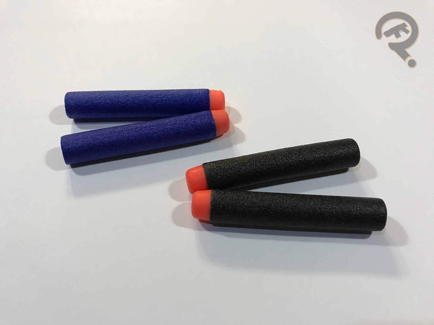 touching them. Opening the front covers is required to fire the second barrels on the top and bottom. The blaster is very sleek and definitely has an appropriate sci-fi feel to it, almost like one of the plasma weapons from Halo. The grip could maybe stand to be a little bigger as I could see someone with larger hands feeling cramped while holding it, but it’s forgivable when you remember the target audience. The main body of the blaster feels on par with other Nerf blasters in terms of structural integrity, but it is worth noting that the plastic for the priming slides feels a little thin, and the front covers are a smoother, slightly more rubbery plastic than the rest of the blaster. The priming stroke on the Quad Blaster is very short and not terribly heavy, as such, the performance is limited. It’s still fine for running around the house, blasting your friends, but even on longer indoor distances, the darts tend to drop off a little sooner than I might like and the impacts can feel kinda flaccid. Again, I can understand this decision given this is meant for children, and Nerf has to keep it’s own core products competitive, but it’s still a bit of a bummer. The Star-Lord Quad Blaster comes with 4 Elite darts but with black bodies instead of the traditional blue. Unfortunately I wasn’t able to find all 4 of mine but I got 2 and some regular Elites for comparison.