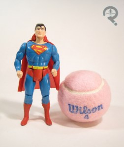 Superman was released in Series 1 of Kenner’s Super Powers line. Like the rest of the line, he’s based on Superman’s entry in the 1982 DC Style Guide (drawn by the consistently fantastic Jose Garcia-Lopez), which is really just the same look Supes had been sporting for almost 50 years at that point, and would go on to sport for another 30. Stylistically, of course, he’s very much a Bronze Age Superman, but that’s something only the most dedicated of fans is really going to care about. The figure stands about 4 3/4 inches tall and he has 7 points of articulation. Superman’s sculpt is definitely top notch; while he’s a little wider than the Garcia-Lopez Superman seen on the packaging, he’s no less well rendered. Like the rest of the line, he is, of course, a completely unique sculpt (and also like so many in this line, this sculpt would be slightly tweaked and re-used for Toy Biz’s DC Super Heroes line). The head has a nice, friendly but strong look about it, which is really just perfect for Superman, and his musculature is actually pretty well balanced. The arms are a little weird, with the preposing and the somewhat unnaturally upright fists, but they don’t look awful. The cape is a separate, cloth piece. It’s done the same way as all of the other capes in this line were done: flat fabric with a little plastic clip impeded in the collar. It’s a kind of a dated look, since it’s not how such things are rendered anymore, but it’s not bad, and I particularly dig the S-emblem on the back of it. In terms of paint, Superman is bright and colorful, and pretty clean. My personal figure has a little wear on a few spots, but he’s generally held up pretty well. As with all Super Powers figures, Superman has an action feature, dubbed the “Power Action Punch.” When you squeeze his legs together, his arms rotate in opposing directions. It’s not as clever as some others, but it’s still pretty fun.