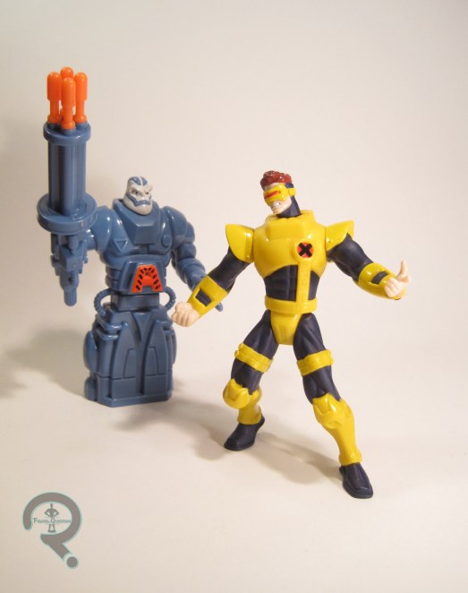 “One of the most powerful forces on Earth, Apocalypse has become the greatest villain in the world of the X-Men. Activating the Apocalypse holo-droid, Cyclops helps the X-Men learn how to fight a foe who is as powerful as his is evil. Avoiding blasts from his gattling gun hand, Cyclops, along with Storm and Jubilee, take down the Robot Fighter with a perfectly timed series of attacks!”