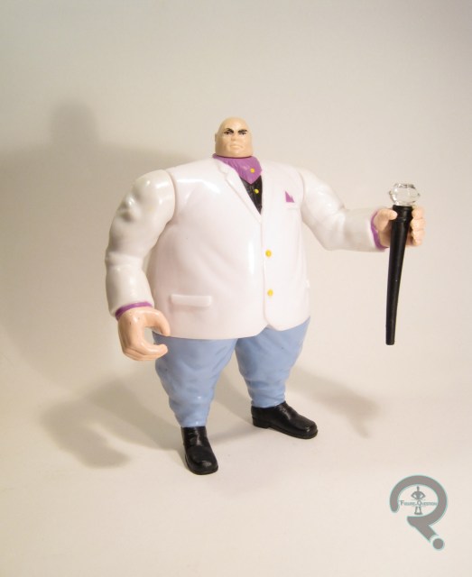 Kingpin was released in the second series of Toy Biz’s Spider-Man: The Animated Series line from the ‘90s. The figure stands a little over 5 inches tall (he’s a bit taller than the average figure from the line), and he has a whole 3 points of articulation. Woooooo. This guy had an all-new sculpt, based on his show appearance, which was also his standard look in the comics for a very long while. It’s certainly a unique sculpt; it’s almost as wide as it is tall. No doubt the cut articulation was to help ensure he’d cost the same as the others in the line. The quality of the sculpt is fairly decent, but not without a few issues. The head is way on the small side, or perhaps the shoulders and arms are in the large side. Either way, the proportions are off. In addition to that, he’s wearing the wrong style of jacket for animated Kingpin; it should be double breasted, but it isn’t. Beyond that, it’s actually pretty decent. The head definitely captures Fisk well, and his overall size is definitely impressive. The paintwork on Kingpin is fairly good work. The colors are all appropriate to the character and the application is all nice and clean. Kingpin is packed with a diamond topped cane, which can be placed in either hand. He also has a “crushing” action feature. His arms can be pulled upwards and clipped into place; when the lever on his back is pulled, they swing down.