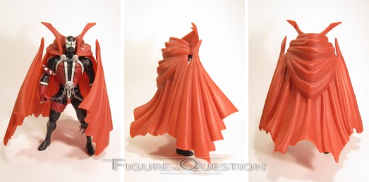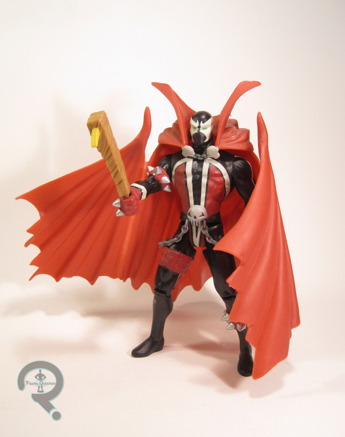 Spawn was released as part of Spawn Series 1. He was the main Spawn of that particular series (there was also a Medieval Spawn released), based on Spawn’s standard look at the time, which is more or less the same look he’s had for all the years since. The figure stands about 6 inches tall and he has 7 points of articulation. His sculpt was new to him (though pieces of it were used elsewhere later). For all of Todd’s insistence that his toys were the next step, this figure feels very much like a slightly dumbed down Toy Biz release. This dude would look right at home with the Spider-Man figures of the same era. The detail work is all rather on the simplistic side, and the details are a little soft, especially as when compared to Todd’s rather sketchy illustrations from the book. I mean, admittedly, I sort of like this look a little bit more than Todd’s stuff, since it’s a little bolder this way. Hands down, the most awkward feature is that damned sentient cape. It’s big, and it’s floppy, and the “hinges” on the sides don’t really work at all. Also, unlike every other cape on every other caped figure ever, there’s this weird extra attachment piece that plugs it into his lower back and keeps it elevated above his shoulders in a really awkward way. When a character whose whole gimmick is his cape looks better without the cape, you may have made a wrong turn at some point. The paint work on Spawn is okay, but not top notch or anything. It gets all the basic work down, but most of it’s pretty fuzzy around the edges, and there’s not really anything beyond the very standard color work. In addition to his removable cape, Spawn also included a….wooden board…with a nail…sticking out of it? I don’t know Spawn that well, but I don’t recall this being one of his signature items.