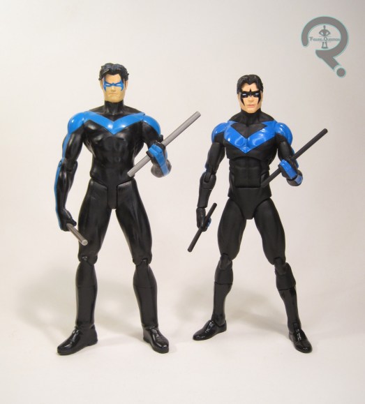 reference, he’s just a smidge shorter than a Bucky Cap-based figure; the only real inconsistency is the head size, but that’s minor. Nightwing gets an all-new sculpt, and it’s a very strong one. The articulation seems quite well worked in, and the figure feels very svelte and streamlined. The build seems about right for Grayson and the etched-in edges to his logo are very nicely handled. I wasn’t 100% sold on the head at first (it’s my love of that old DCD Nightwing’s head kicking in there), but after taking the figure out and viewing it from a number of different angles, I’m really happy with it. Nightwing’s paint work is very strong, apart from one minor issue: the color of his mask. If this is really a “Hush” Nightwing, then the mask really should be blue, not black. To be fair to DCC, only the original release of the Hush Nightwing figure got that detail right; all of the re-issues changed it to black. I have to wonder if it’s some sort of “brand identity” thing. Beyond that, the paint’s great. The glossy sheen helps the blue to pop really well up against the matte black, and I also like the high-gloss boots. This is a very polished looking figure. Nightwing is packed with his standard Escrima sticks, a batarang attacked to a grapple, and three pairs of hands in fists, and two variations of gripping. Not a bad assortment.