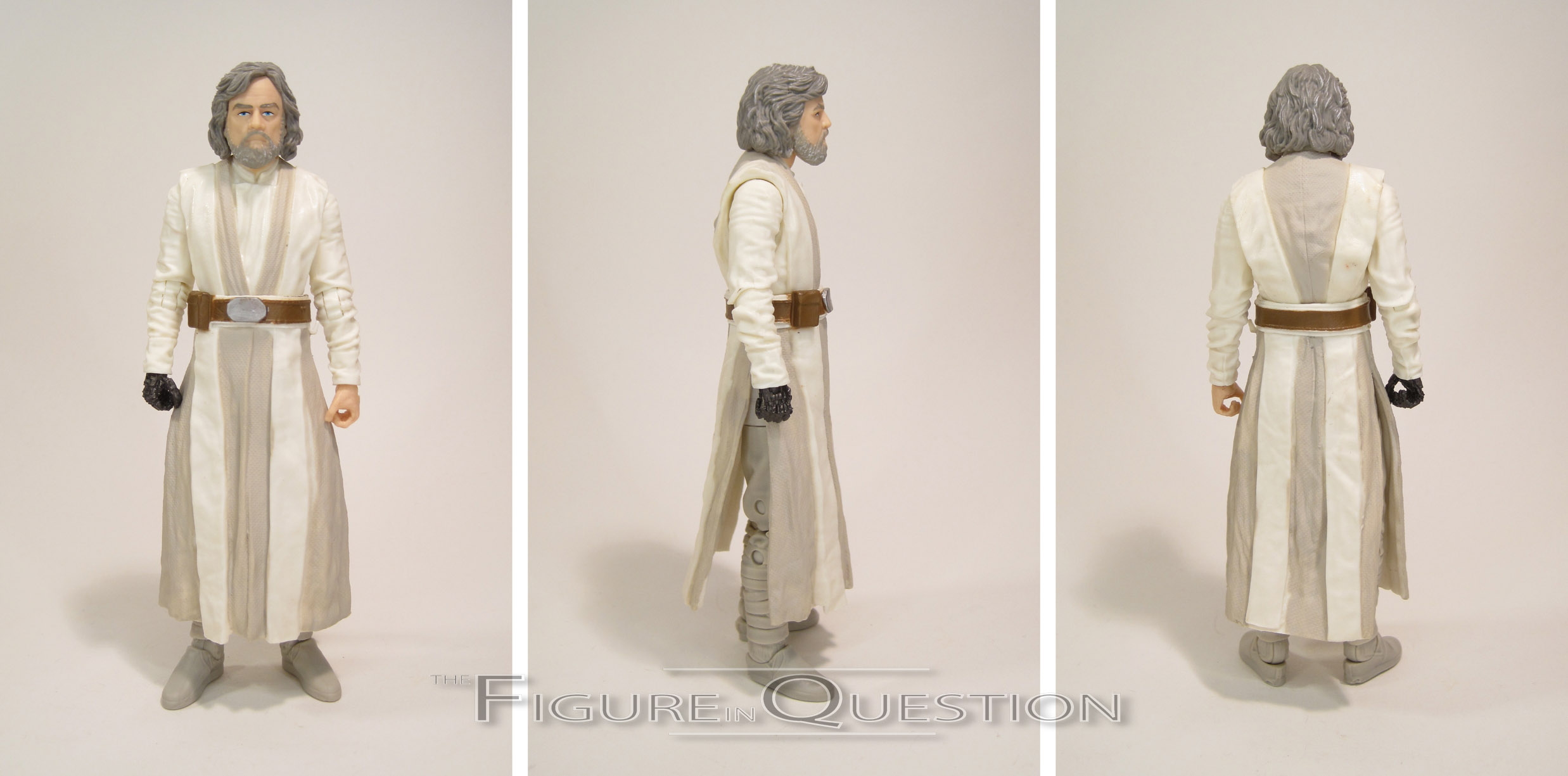 Jedi Master Luke Skywalker was released in the first assortment of The Last Jedi-themed Star Wars: The Black Series figures. He’s figure 46, which makes him the second to last figure in the set numerically. This figure also saw an early release at SDCC this year, in a two-pack alongside Jedi Training Rey. As far as I can tell, the only difference is the packaging; the actual figures are the same. Like the smaller Jedi Master Luke, this one is sporting his garb from the end of The Force Awakens, which is certainly a solid design. The figure stands a little under 6 inches tall and he has 25 points of articulation. The joints in his legs are obviously a little bit restricted by the lower portion of his robes, but you can still manage some fairly decent poses, and the rest of the joints are thankfully left unrestricted. Luke’s sculpt is all-new, and does a pretty respectable job of capturing Luke’s look from the two films. The likeness on this figure is a reasonable approximation of Hamill, though I think I might actually like the smaller figure’s take just a little bit more. Similarly, I do find myself drawn to the detailing of the smaller figure over this one. It’s not that this one’s bad at all. He’s actually quite well-done. There’s a lot of nice layering and wrinkling to the clothing. I just find it to be a little softer than the smaller figure, and I’m not a huge fan of that. I’m also not a huge fan of the generic gripping pose on the hands, especially since he doesn’t include anything to hold. It just seems to me that some more specific gestures might make for more dynamic posing options. Also, like the smaller figure, this one had a loop from which to hang a lightsaber hilt, albeit one that’s not included. I’m still appreciative of the forward thinking on Hasbro’s part, though; it’s not like I don’t have any Skywalker sabers laying around. The paintwork on Luke is decent enough. The best of it’s definitely on the head, which has some nice accent work on the hair and beard, as well as some of the cleanest eyes I’ve seen from this line so far. In terms of extras, Luke’s got his cloak, which is a fabric piece. It’s not great. There’s no real way to keep it in place on the figure, so it just really flops off of him a lot. I can’t see myself using it much.