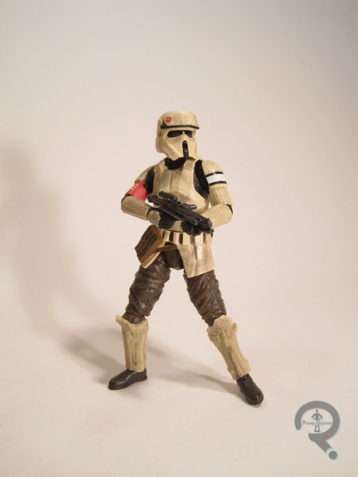 The Scarif Stormtrooper Squad Leader is the fourth and final figure from the Rogue One assortment of the Walmart-exclusive small-scale Star Wars: The Black Series line. Of the four, this guy was by far the most difficult to acquire (which is part of why he’s being reviewed four months after the other three), largely due to his status as an army builder. The name on this guy is a little confusing. He’s listed as the “Squad Leader,” which is the name generally associated with the more decorated guy from the two-pack with the Moroff. That name was again used for the more decorated look in the larger Black Series, where the look seen here was listed simply as “Scarif Stormtrooper.” And when this look showed up in the basic line, it was “Shoretrooper.” If I had to guess, I’d say Hasbro may have been initially planning to release the guy from the two-pack, but changed their minds after the packaging was underway. At the end of the day, none of this actually affects the figure, though, so I guess it doesn’t really matter that much. The figure stands a little under 4 inches tall and he has 26 points of articulation. As with the rest of his assortment, the Shoretrooper’s articulation represents a marked improvement over the Force Awakens offerings from the prior year. I’d place this guy on par with Cassian in terms of posabilty. It’s nice that Hasbro put in the effort on these guys, since they’re probably less likely to see new figures going forward. The sculpt on this guy is totally unique to him; no parts shared with any of his less articulated brethren (though I feel certain we’ll be seeing most of this body again for the Vintage Collection Hovertank Pilot). It’s definitely solid work, and on par with the larger version of the same design. The helmet could perhaps be a little sharper, but the detailing on the body is definitely top-notch. The paint on this guy is definitely solid work. All of the base work is pretty clean and the colors match what we see on-screen. Like the larger Shoretroopers, he gets some dirt and grime, to help make his armor look a bit more used. It’s a nice touch, and really adds a lot to the figure. The Shoretrooper is packed with a standard E-11 Stormtrooper blaster. That’s a bit less than the others in this assortment, so he feels a little light, but it’s not terrible.