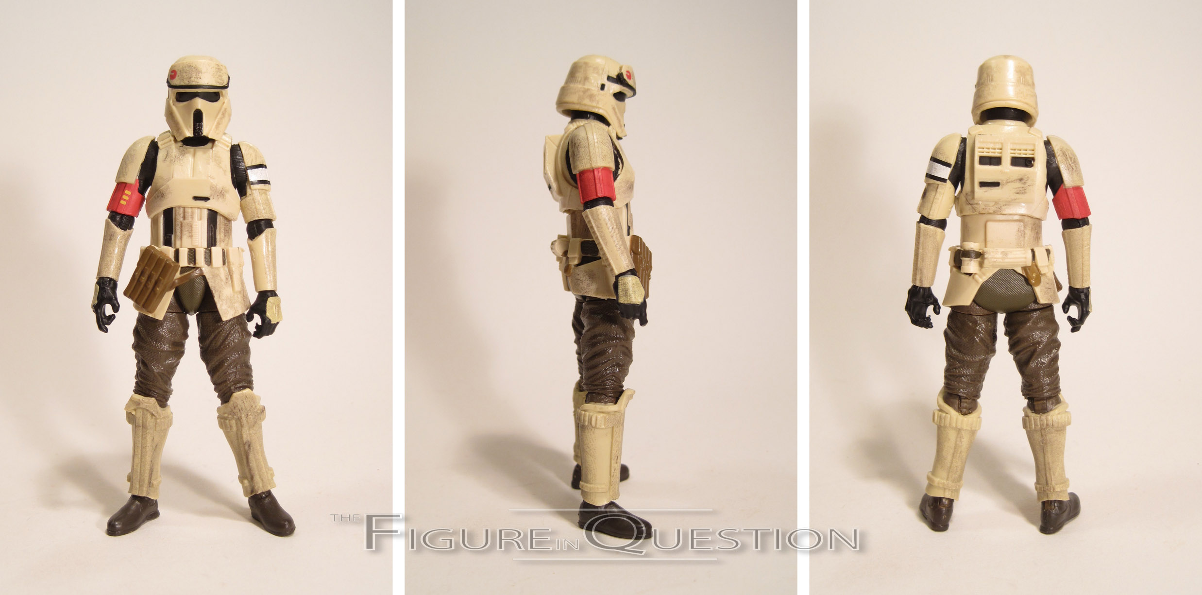The Scarif Stormtrooper Squad Leader is the fourth and final figure from the Rogue One assortment of the Walmart-exclusive small-scale Star Wars: The Black Series line. Of the four, this guy was by far the most difficult to acquire (which is part of why he’s being reviewed four months after the other three), largely due to his status as an army builder. The name on this guy is a little confusing. He’s listed as the “Squad Leader,” which is the name generally associated with the more decorated guy from the two-pack with the Moroff. That name was again used for the more decorated look in the larger Black Series, where the look seen here was listed simply as “Scarif Stormtrooper.” And when this look showed up in the basic line, it was “Shoretrooper.” If I had to guess, I’d say Hasbro may have been initially planning to release the guy from the two-pack, but changed their minds after the packaging was underway. At the end of the day, none of this actually affects the figure, though, so I guess it doesn’t really matter that much. The figure stands a little under 4 inches tall and he has 26 points of articulation. As with the rest of his assortment, the Shoretrooper’s articulation represents a marked improvement over the Force Awakens offerings from the prior year. I’d place this guy on par with Cassian in terms of posabilty. It’s nice that Hasbro put in the effort on these guys, since they’re probably less likely to see new figures going forward. The sculpt on this guy is totally unique to him; no parts shared with any of his less articulated brethren (though I feel certain we’ll be seeing most of this body again for the Vintage Collection Hovertank Pilot). It’s definitely solid work, and on par with the larger version of the same design. The helmet could perhaps be a little sharper, but the detailing on the body is definitely top-notch. The paint on this guy is definitely solid work. All of the base work is pretty clean and the colors match what we see on-screen. Like the larger Shoretroopers, he gets some dirt and grime, to help make his armor look a bit more used. It’s a nice touch, and really adds a lot to the figure. The Shoretrooper is packed with a standard E-11 Stormtrooper blaster. That’s a bit less than the others in this assortment, so he feels a little light, but it’s not terrible.