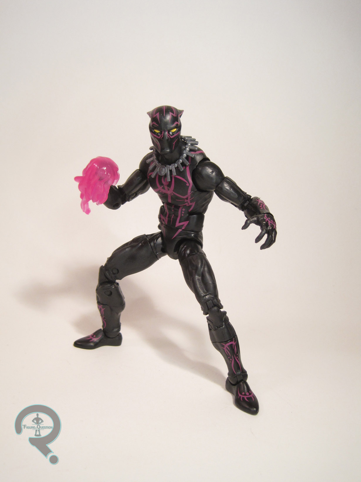Black Panther is a Walmart-exclusive Marvel Legends release, just like the last comic Panther. While he’s not officially tied to any particular series of the line, he started hitting right around the same time as the Okoye Series. Thanks to Walmart’s weird distribution style, he actually ended up arriving at a lot of stores less than a month after the last Black Panther-exclusive. Hopefully, this doesn’t lead to issues of shelf warming for either of them. The last Panther opted for a very classic take on the character but this figure goes for his most recent redesign from the “All-New, All-Different” relaunch. It’s generally not terribly far removed from his other looks, but there are some minor tweaks. The figure stands 6 1/2 inches tall and he has 32 points of articulation. The last two comic Panthers were built on the Bucky Cap body. This figure mixes things up a bit, moving T’Challa to the Spider-UK body. This means he’s also the first non-Spider-Man on the body, which I suppose is pretty cool. It’s a nice base body to be sure, and I think it’s quite a good fit for Panther. I’m not sure which base body I prefer for him, honestly. Of course, his more recent design has also been drawn with a generally more stocky appearance, so I think this might be a case pf both bodies being totally valid choices. The figure gets a new head, as well as the hands from the Rocket Raccoon Series Panther, and an add-on piece for his necklace. The head is a pretty solid piece, and a decent translation of artist Brian Stelfreeze’s more streamlined take on Panther’s mask. While the swept back ears take a little bit of getting used to, it certainly makes for a distinctive figure. The hands fit well on the figure, and in fact look a bit better scaled to this particular body. I was admittedly a little surprised by the return to these hands after they were left off of the last comic Panther, but they’re still decent pieces. The necklace I can kind of take or leave. It looks fine, but it’s a bit too loose fitting for my taste. As far as paint goes, this guy’s a bit different from prior Panther figures. Recently in the comics, T’Challa’s begun to experiment with tactical applications of Vibranium’s energy output, resulting in this glowing look when his suit is fully activated. There’s a bit of a Tron-lines thing going on all throughout the figure. He’s very pink (Does that make him the Pink Panther? Only Inspector Clouseau can know for sure). The line work is all pretty clean, and it certainly helps him to pop a bit on the shelf. Panther includes an extra head without the pink details, as well as a spare set of hands in fists, and two energy effect parts. The hands and energy parts are definitely fun, but the head baffles me a bit. It’s just the same head without the extra detailing. When placed on the body, it looks kind of out of place, and it’s too large to look right on the last Panther body. I would have much rather have gotten an unmasked T’Challa.
