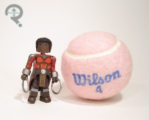 Okay, so, right off the bat, this figure’s a bit of a misnomer. Nakia is not a part of the Dora Milaje. She *is* wearing one of their uniforms (since it was what was available in the few moments before she charged into battle), but that hardly makes her one of them. In fact, it’s kind of an important plot point that she’s not bound to their oaths. So, yeah. Nakia is based on the standard ‘mate body, so she’s roughly 2 1/4 inches tall and she has the usual 14 points of articulation. The figure has four add-on pieces for her hair, belt/skirt, and wrist bands. All of these are new to Nakia, and they work pretty well for her. I think the shaping of the hair is a little off; it should be more top heavy than it is. The paintwork is pretty solid. The likeness is sort of generic, but it’s not awful. The details on the uniform are sharp and cleanly applied, and she’s quite on the colorful side, which is always a plus. Nakia is packed with her pair of hoop blades, as well as a clear display stand.