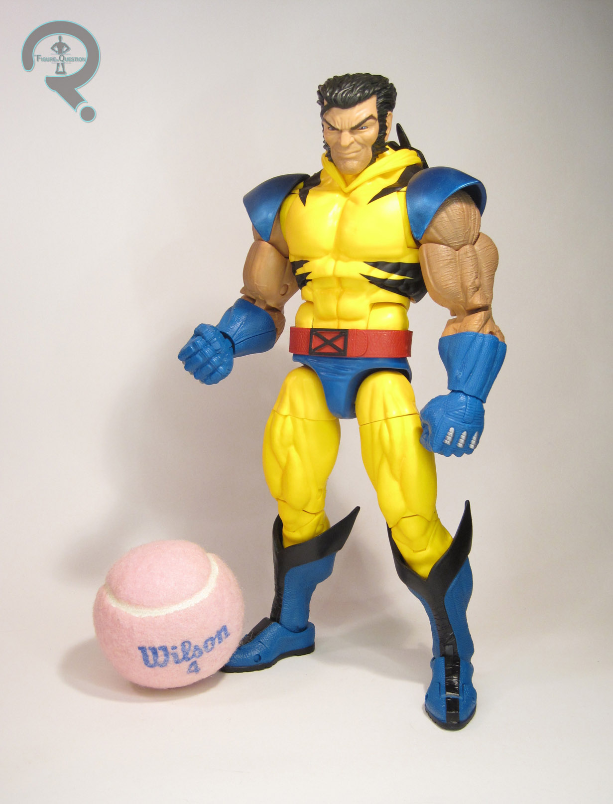 Wolverine is a 2018 release for the 12-inch Marvel Legends line.  He’s done up in Wolverine’s classic blue and yellow tiger-stripe costume, which actually doesn’t have a Legends release in the scale (since the Toy Biz Icons figure was in his Astonishing costume), so it’s a pleasant choice.  It’s also worth noting that it predates the release of the same design in the regular Legends scale for this iteration of Legends, though that’ll be amended later this year.  The figure stands just shy of 12 inches tall and he has 36 points of articulation.  Wolverine is rocking an all-new sculpt, albeit one that is at least a little bit inspired by the smaller scale brown costume Wolverine.  It’s pretty solid overall.  The texture work on his arms, his boots, and his gloves is very impressive, and while the proportions aren’t exactly lifelike, they do match up pretty well with how Logan is usually depicted.  While I like the head sculpt overall (especially the sheer amount of character in the small section of his face we can see), I do feel that the ears of his mask are shaped a little bit oddly.  It’s possible this was caused by some slight warping from the packaging.  Whatever the case, it’s not awful, and it certainly doesn’t ruin the figure.  Interestingly, despite how most figures in this line have been handled, Wolverine’s design is actually unchanged from his comics appearance.  That’s certainly a bold move.  The paint continues this, presenting his costume in all it’s bright, primary colored glory.  It actually works really well with the sculpt, and it’s applied quite nicely.  I particularly like the accent work on the yellow, which helps to prevent it from looking too bland and void of detail.  Wolverine includes an unmasked head and pulled back mask, a set of un-clawed hands, and an extra head and shoulder pads depicting battle damage.  My favorite parts are definitely the damaged bits, as they make for quite a dynamic look for the figure.