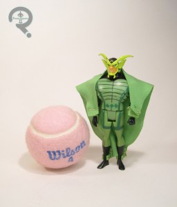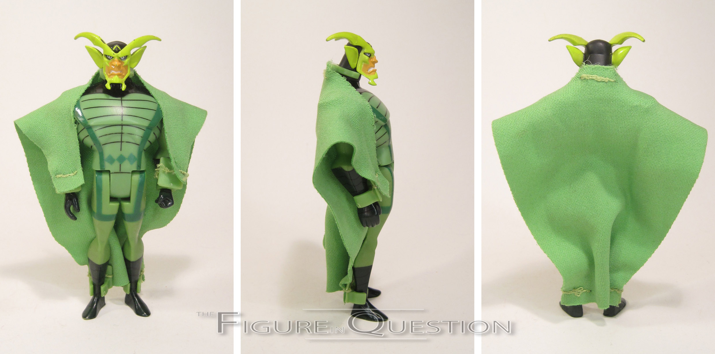 Mantis was released as part of the amusingly typo-ed “Attack from Apolkolips” 6-pack from Mattel’s Justice League Unlimited line. That’s the best name I’ve seen since the good old days of “Muntant Armor.” The figure stands 4 3/4 inches tall and he has 5 points of articulation. He’s built on the large male body (patterned after the original Justice League Superman), which is a good fit for the character. He’s got a brand-new head sculpt, and though it’s made of rather rubbery plastic, it’s actually a pretty decent piece, rather deftly recreating Mantis’ design from the series. Mantis’ “wings” are handled here has a cloth cape piece. In a line of figures that used almost exclusively sculpted pieces for such things, this seems a little out of place, especially since it’s not a particularly *good* cloth cape. There’s no hem on the outside, and it’s held in place by some rather obvious clips. Organic flow is not among this figures strong suits. The paint work on Mantis is decent enough; his colors all match up well with the on-screen ones, and the greens are nice and complimentary. There’s a little bit of slop on his face and mask, but he’s otherwise pretty clean, and the detail lines on his costume are quite sharply defined. Mantis included no accessories, but this was within the norm for the multi-pack figures. Also, having seen a number of the accessories that were included with the single-carded figures, I can hardly feel like I missed out on anything.