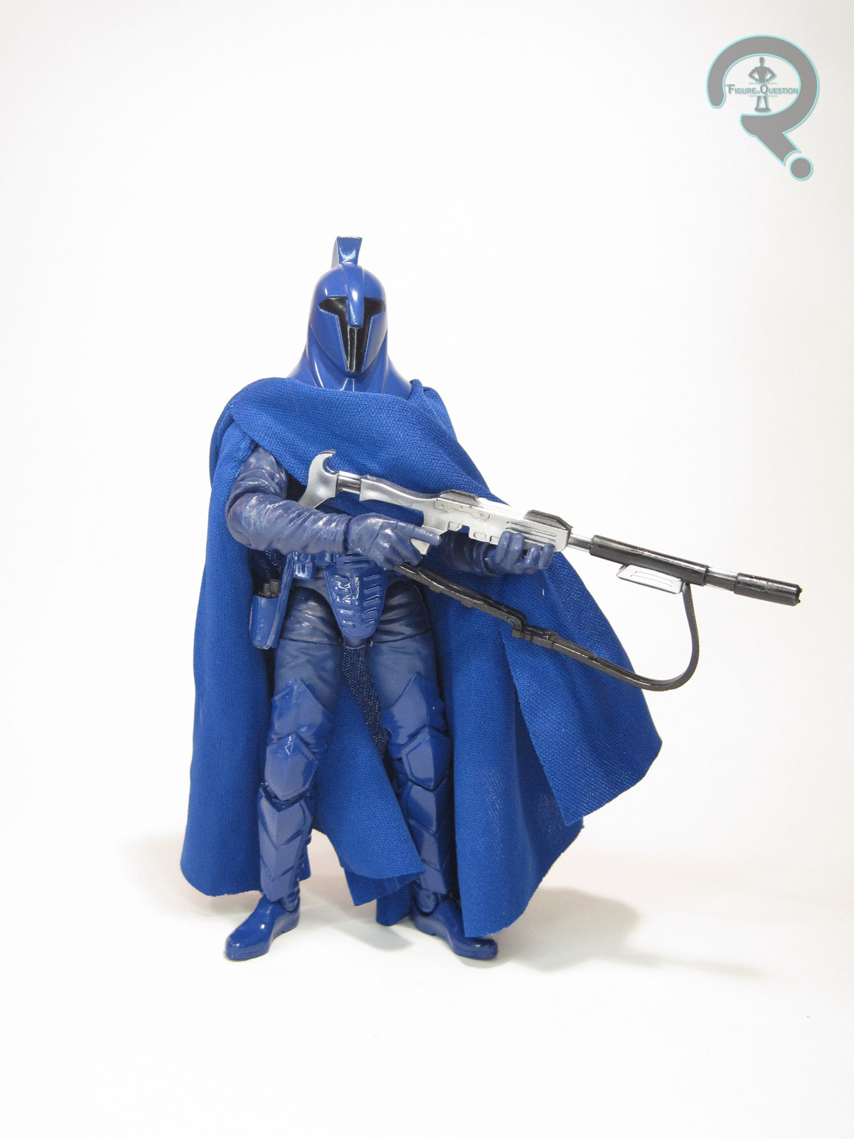 Though largely forgettable, the Senate Guards appear in both Phantom Menace and Attack of the Clones, and were technically in Revenge of the Sith, I guess. Their best showcase, however, came via the Clone Wars cartoon, where, admittedly, they had a slightly tweaked design. Of course, the film design is essentially the same as the Royal Guard, thereby allowing for some serious parts re-use. The figure stands 6 inches tall and he has 26 points of articulation. The Senate Guard’s sculpt is a mixed-media affair. The bulk of it is sculpted, though it’s largely hidden by a cloth cape. A cape, which, by the way, is a lot better tailored than a lot of the cloth parts from this particular line. Under the cape, there’s a fully detailed, fully armored body. This armor design first showed up in toy form back during the Revenge of the Sith days, shared by the Senate and Royal Guards from that line. The sculpt is top-notch, and the armor is nice and sharp. The arms are just a touch on the long side, but that makes them look a bit better when the cape is pulled down. The Senate Guard’s helmet is actually one of my favorite designs from the prequels. It’s got this cool futuristic Spartan warrior flair to it, which is quite fun. The paint work on the Senate Guard is quite subtle, with lots of variations of blue. The armor is appropriately shiny, which looks nice. The blue on the cape matches pretty well with the paint and molded plastic, which is definitely a plus. The Senate Guard is packed with a blaster rifle, which he can hold in his hands, or sling over his shoulder, as well as a small blaster to keep in his hip holster.