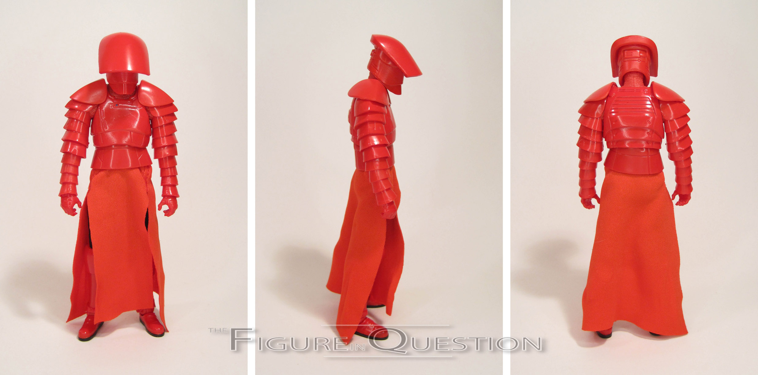 Last up, we’ve got the most recent, and most unique of the designs in the set, the Praetorian Guard. I’ve already looked at one Black Series Praetorian Guard. This one’s got a new hat different helmet. Hasbro released all three styles of helmet in both scales; this one is the “hat-wearing” helmet that we also saw in the two-pack with Rey. Probably my least favorite of the three designs, but a solid one nevertheless. Anyway, this figure stands 6 1/4 inches tall and he has 29 points of articulation. He’s largely the same figure as the other Praetorian Guard. The big change is obviously the helmet, which it just as nicely detailed here as it was on the smaller figure. The other, more subtle change is the skirt, which is now a cloth piece instead of sculpted. It matches better with the rest of this set, but it means he’s not consistent with the other two Praetorian Guards, which is rather frustrating. Also, while it improves posability, I don’t find it looks quite as good. The Praetorian Guard is packed with his axes that snap together into a bladed staff, just like the smaller figure.