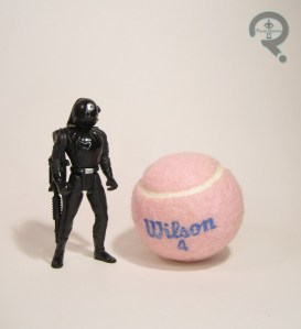 The Death Star Gunner was released in the 1996 assortment of the Power of the Force II line, the same assortment that got us the Sandtrooper, it should be noted. The figure stands 3 3/4 inches tall and he has 6 points of articulation. The Gunner’s sculpt was all new to him, though he’s certainly got some similarities to both the TIE Fighter pilot and the standard Imperial Officer in terms of design. The main selling point of this particular design is the helmet, a unique design that never really cropped up, despite the franchise’s propensity for re-using such things. It’s a cool design, and brings to mine a knight’s helmet, with the under-biting faceplate. It’s a shame this guy never amounted to all that much. The sculpt is a pretty decent one. The best work’s definitely on the helmet, but the rest of the body is pretty respectable as well. He’s still undeniably bulky, but compared to earlier entries in the line, he’s fairly tame. He’s also not all that pre-posed, which is alright, I suppose. There’s some solid work on the folds of his uniform, showing some definite progress from earlier, much more simplistic figures. Paint is rather minimal on this particular figure. It’s a lot of black, but they do at least give us two different finishes, just like what we saw on the TIE Pilot. It’s a good way of keeping him from being too drab. The Gunner, living up to his name, included a pair of guns. There’s the standard Stormtrooper blaster, as well as a heavy blaster, which I quite like.