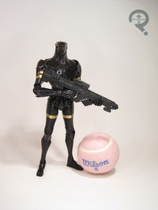 K-Tron is part of the first (and it would appear, only) series of NECA’s Valerian line. The figure stands 8 inches tall and he has 34 points of articulation. K-Tron’s articulation is mostly pretty good, with the only real restrictions being on his shoulders, which are a little tight. This is partly due to the design of the character, and just partly due to some slightly stuck joints. It’s hardly enough to keep him from being put into lots of fun poses, though. K-Tron’s sculpt is wholly unique to this figure, and he lives up to the usual NECA standards. Everything is clearly defined, and the details are all very sharp. He shares more than a few similarities with some of their Pacific Rim figures. Those were some of their best, so this guy does pretty well by association. Having not seen the movie, I can only go by the images I’ve found online, but NECA seems to have done a pretty good job of accurately recreating the design in all of its sleekness. K-Tron’s paintwork continues the trend of sleekness with the design. The glossy black looks really sharp, as do the white insignias on the shoulders. The gold bands are a little fuzzy around the edges, but are okay overall. K-Tron is packed with a rifle. It’s got some pieces that are practically begging to be snapped off, but that’s accurate to the film design.