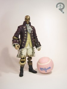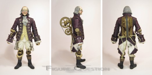 The Benjamin Franklin Motorized Patriot is the second to last release in NECA’s Bioshock Infinite line. He’s the second of the Motorized Patriot after the George Washington version from earlier in the line. Unlike Washington, who was actually in the game, Franklin is just a concept figure. The figure stands 9 1/4 inches tall and he has 19 points of articulation. Ben shares most of his pieces with the first Motorized Patriot. The movement on the joints is a little bit stiff, especially on the legs. That right knee in particular doesn’t have much budge to it. With that said, you can definitely get the basic standing poses the Patriots stand in in-game, and he’s pretty stable. The body sculpt is up to NECA’s usual standards, with sharp, crisp detailing on the uniform, and some very nice dynamic work on the folds and wrinkles, which matches up pretty decently with the game stylings. This figure removes the shoulder pauldrons from the Washington Patriot, which actually does quite a bit to change up the general shaping of the figure, and sell him as a more unique “character.” Also helping sell him as a new character is the unique head, which captures the classical Ben Franklin image. It does look perhaps slightly off on the thinner Washington body, but it’s a solid sculpt in its own right. In contrast to Washington, Ben gets to keep both of his eyes, though one of his lids is broken, helping to keep up that sort of creepy appearance. The paint work on Ben is pretty impressive. He swaps out the blue of Washington’s military jacket for a deep purple, which works quite well for the design. The application is all quite clean, and the accent work on his uniform does a lot of favors for the sculpt. The Patriot’s primary accessory is his main weapon, the Peppermill gatling gun. It features a spinning barrel and a rotating handle, and is just generally a pretty cool piece. The only slight downside is that the handles are the slightest bit too big for the figure’s hands, which can easily cause breakage if you aren’t careful. Fortunately, you can pretty easily mod the figure’s hands by cutting the connection between in thumb and forefinger, and that saves a lot of trouble. The Patriot also includes a pair of Columbia flags, for mounting on the figure’s back, as well as an alternate head, sans the Franklin mask, which is also appropriately creepy.