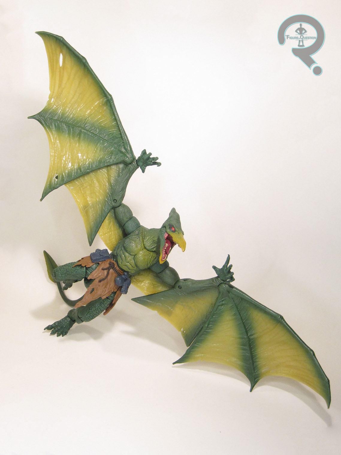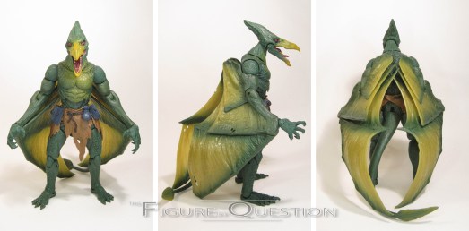 Sauron—or should I say Dr. Karl Lykos (Marvel’s Sauron), as he is fully named on the box—is the Build-A-Figure for the second Deadpool-themed series of Marvel Legends. I don’t know that Sauron and Deadpool have aver had any notable interactions, but if it gets me a Sauron figure, I’m certainly not going to complain. The figure is 7 1/2 inches tall with a 12 inch wing-span, and he has 33 points of articulation. There’s a lot of very unique types of articulation, especially within the torso, where a combination of ball-joints gives him a very wide range of very smooth movement. He’s also got an articulated jaw, just like the old 5-inch figure. Sauron is sporting an all-new sculpt, and what a beauty it is. There’s amazing texture work all throughout it, detailing his craggly reptilian skin quite nicely. He’s quite accurate to what we tend to see of Sauron in the comics, but it’s got this nice real-life feel to him as well. It’s the kind of detail work that really calls back to when Toy Biz was doing figures like Man-Thing, and that’s a definite plus. It’s great to see that Hasbro can pull off this sort of work when they put the effort in. But of course, even the best sculpt can be marred by a sub-par paint job. Fortunately for Sauron, he gets one of Hasbro’s best offerings in this arena. His skin features some quite subtle highlight work, which helps to keep him from looking too bland with all those large patches of the same color. The paint also properly lines up with all of the sculpted details, including the various pouches on his belt, and all of his teeth. No missed applications here, which is always quite nice to see. His wings are molded in a partially translucent plastic, giving them the proper stretched skin appearance. There’s quite a nice fade-in front he solid green to the translucent, which helps to really sell it all as one thing. Sauron has no accessories, but given the size of the sculpt including the wings and such, it’s definitely acceptable.
