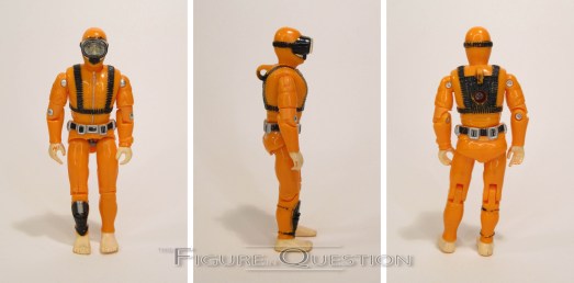 The pilot is one of the more intricately designed of these figures; unlike the Marine and the Soldier, he and the Diver are actually based on fully decked-out Joes with parts from some of the supplemental sets. He’s seen here in his full pilot’s gear…or he would be if mine weren’t missing a few pieces. The Pilot is sporting an all-new sculpt, and while it’s still not quite up to Hasbro par, it’s certainly a stronger sculpt than either of the other two I’ve looked at, and is perhaps the strongest in the set. The details are more numerous, and the overall construction is a bit less rudimentary. He also gives us our only true look at the “standard” Joe head, which is a decent replica of the old 12-inch figures. His paintwork is fairly decent, and certainly better spread out and more complete than the Soldier’s. The blue/yellow combo is another non-standard look, but it works well, and it’s slightly less situational than the others in the set. The Pilot was the only one of these to actually include an accessory, which was a removable helmet. Unfortunately, I’ve lost mine, which is a real shame.