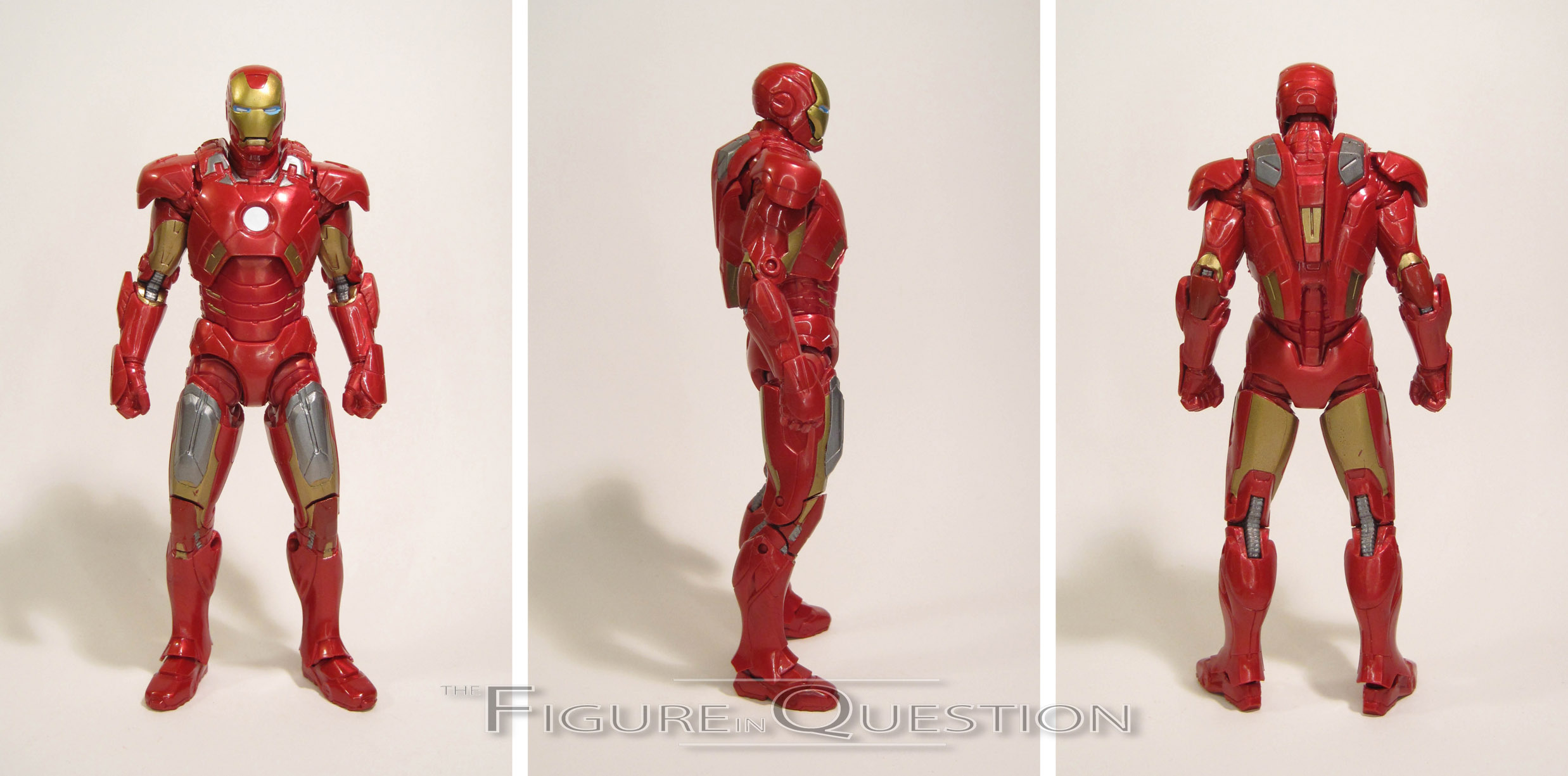 The Mark VII Iron Man is entry 3 in Hasbro’s Marvel Studios: The First Ten Years sub-line of Marvel Legends. He is the final of the three single-packed offerings from the line, following the previously reviewed Red Skull and Ronan the Accuser. This is, of course, Tony’s Mark VII armor, which he sports during the proper assemblage of the Avengers during the film’s big climactic battle. The figure stands 6 1/2 inches tall and has 37 points of articulation. Not only does this figure have the most articulation of any of the movie Iron Men, it’s also implemented in the most workable fashion here, meaning that the Mark VII is hands down the most posable MCU incarnation of Iron Man in the Legends line-up. Though it takes a little bit of cheating, you can also get his signature three-point landing out of this figure, which ended up being one of its selling points for me. What’s more, you can even move all of the flaps on his back, and his head can almost look straight up. We saw a lot of improvements in this direction fro both the Mark 46 and Mark 50 releases, but this guy really seems to take everything they’ve learned and even further build on that. Obviously, with all of this improved articulation, you kind of need an all-new sculpt, and this one’s a very good one. Thanks to a much-delayed release, Hasbro was able to actually make the figure as faithful to the film as possible, and they’ve generally succeeded. There are still a few little details here and there, but he’s very, very close. The biggest plus for me is that, unlike the IM2/IM3 armors, this one is actually properly scaled with the rest of the MCU Legends, and can conceivably be an actual guy in a suit of armor. The paint work for the Mark VII is solid, and again, one of the strongest entries we’ve seen for an MCU Tony. The metallic red plastic works very well, being neither too bright or too dark, and the rest of the application is pretty clean. There’s a slight scuff on my figure’s right leg, but he’s otherwise pretty good. The Mark VII is packed with a second set of hands, this time in the repulser blast pose (which, sadly, continue the tend of not having the same articulation as the fists), as well as the now-standard blast-effect pieces, this time in a transparent yellow. I was a little saddened that there was no unmasked head this time, which is about the only major complaint I can lobby against this figure.