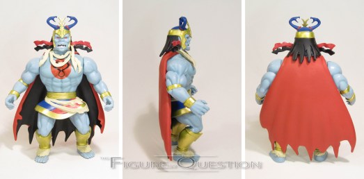Mumm-Ra is one of the four figures in the first series of Savage World: Thundercats. While some of the other lines have been sort of modifying the characters to better fit the Savage World style, the Thundercats line are more straight adaptations of the characters. This Mumm-Ra in particular is based on his powered up “Mumm-Ra, the Ever-Living” form, which is a sensible choice, given its inherently muscle-bound appearance. The figure stands 6 inches tall going by the top of the horns (about 5 1/2 without them) and he has 6 points of articulation. The sculpt is unique to Mumm-Ra, and is a pretty sensible recreation of his design. Obviously, he’s super buff, as is the style for the line, but given the usual look for Mumm-Ra, it’s not much of an adjustment. The detailing on the sculpt is clean and sharp, and the head in particular has a lot of really nice detail work on both the face and the helmet. The cape is affixed to the torso, and not removable, which was slightly surprising, but I don’t mind it too much, since it means it’s not flapping all over the place. Like the sculpt, the paintwork on Mumm-Ra is clean and sharp. He’s bright and eye-catching, and he has all of the important details that he should. He doesn’t really have any of the smaller details like the Leatherface did, but it’s befitting of Mumm-Ra’s cleaner design. Mumm-Ra is packed with his double-bladed sword, which he has a little bit of trouble holding, but is otherwise a pretty cool piece.