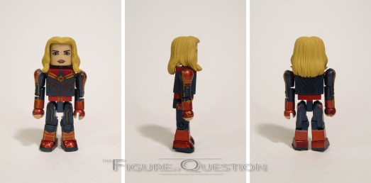 Seen here in her main colors from the end of the film, this is the definitive Captain Marvel release for the set.  Amazingly, this is only Carol’s third Minimate, and her second under the title of Captain Marvel.  The figure’s built on the standard body, so she’s 2 1/4 inches tall and has 14 points of articulation.  She’s got an add-on for her hair, which appears to be a new piece.  It’s a respectable match for her hairstyle from the movie.  It’s a little restricting on the articulation side, but it’s hardly the worst.  She’s also got an alternate helmeted piece, which is another new part.  It’s accurate to the film, and cleanly sculpted, but it doesn’t quite line-up so well with the face on this one.  The paint on this figure’s not bad.  I definitely dig the metallics, though some of the basic applications are a little sloppy around the edges.  The helmet probably gets the worst overall work; in addition to not really lining up with the face, it’s also got a really wonky misprint on the eyes, so make sure to keep an eye on that.  In addition to the helmet, Carol is also packed with a flight stand and a clear display stand.