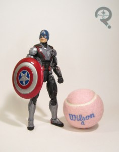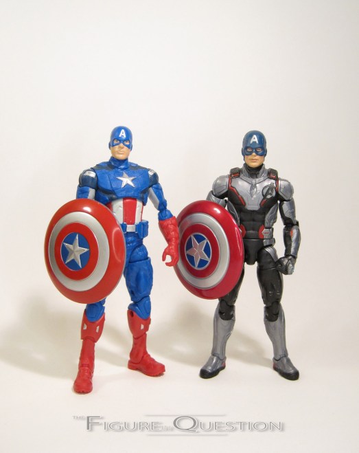 Captain America is part of the first series of Endgame-themed Marvel Legends, which is currently arriving at most retail establishments. He’s an unnumbered figure, due to being the one figure in the set not necessary to complete the Armored Thanos Build-A-Figure, much like last year’s Mark L Iron Man. The figure stands 6 1/2 inches tall and he has 32 points of articulation. The whole sculpt of this figure is new, though it should be noted that the body has already been re-used for Hawkeye in the Target-exclusive Hawkeye & Black Widow two-pack. As noted in the intro, this figure is based on Cap’s quantum suit-sporting look. It’s an interesting choice for our first Cap in the line. While I’m not opposed to a uniformed look in principle, it does take some getting used to for a character like Cap, who has a more established solo look (and even has a brand-new solo look for the movie that we’ve yet to see any toy coverage for at all). Still, these are the looks getting the clear push for merch, so I can’t really blame them for going with him. The body is built to pull double-duty, so it’s maybe not a spot-on build for Chris Evans as Cap, but it works reasonably well, and I can understand their desire for a single body, especially with the two-pack’s included extra heads. The suit itself is a pretty solid design, and I think it’ll look good in action. Cap gets a unique head sculpt, and if I’m honest, it’s one of the more perplexing pieces of the figure. He’s wearing a helmet that appears to be the same design as the one he had in the first Avengers. While not a bad design, it’s been supplanted by the Winter Soldier-style helmet for a while now, and that’s even the helmet that is shown on the images on the back and sides of the packaging, making this older helmet seem out of place. However, the helmet’s on this figure, the basic figure, and even the Minimate, so perhaps there was a change during production of the film. What’s even more surprising, is that he’s wearing a helmet at all, since the concept art and trailers have all depicted Cap without any headgear while sporting the quantum suit. Again, this is the sort of thing that might make more sense once I’ve seen the movie. Whatever the case, it’s actually a rather nice sculpt, and I can definitely foresee a lot of people modding this to replace the Walmart exclusive figure from the first movie. The figure’s paintwork is reasonably well-handled. There’s a bit more slop than I’ve seen on other recent Legends, and some scuffing on the legs on my personal copy, which I was a little annoyed by. Also, the printed face doesn’t seem to have worked quite as well for this particular figure, and results in him looking a little bit messy. The darker silver of the armor also seems to be in contrast to the more straight white we’ve been seeing in the trailers, but that could be a lighting thing. It doesn’t look too terribly off here. The real Achilles’ heel of this particular figure is the accessory compliment. He’s got his shield…and that’s it. The shield’s nice and all, and at least it’s the new and improved sculpt from the 10th Anniversary set, but he feels really, really light, especially with no Build-A-Figure part. The lack of an unmasked sculpt is definitely the biggest killer, especially since the really nice unmasked head from the 10th Anniversary isn’t compatible with this release. A slightly retooled release of that would have added a lot to this figure.