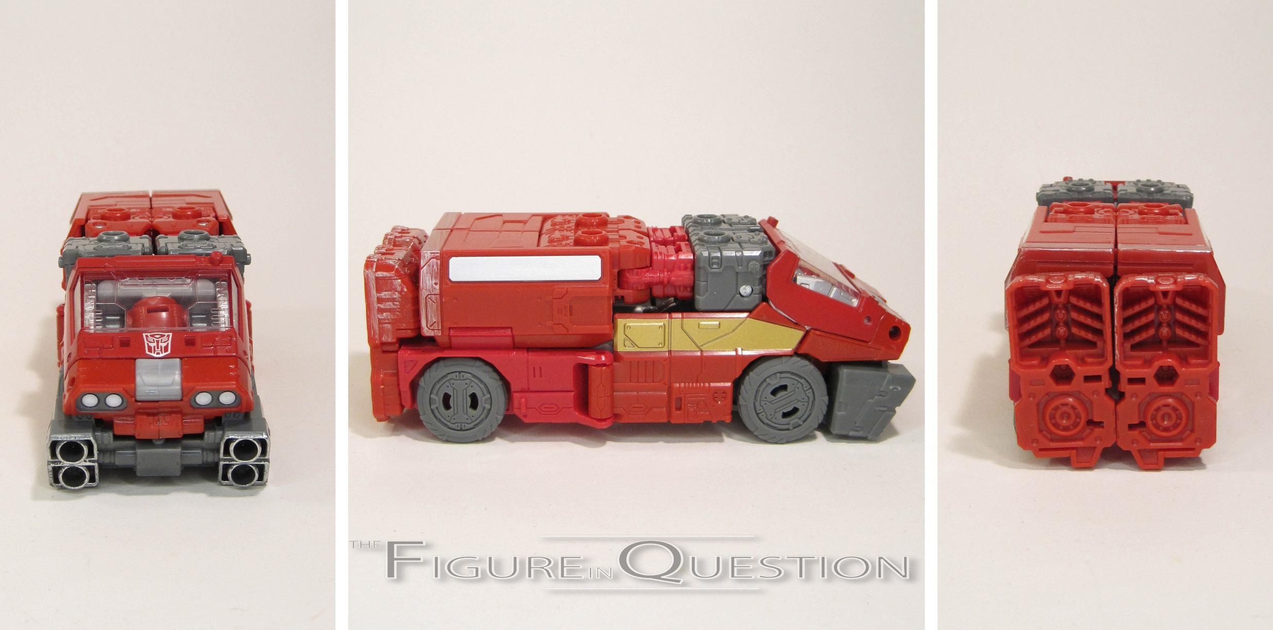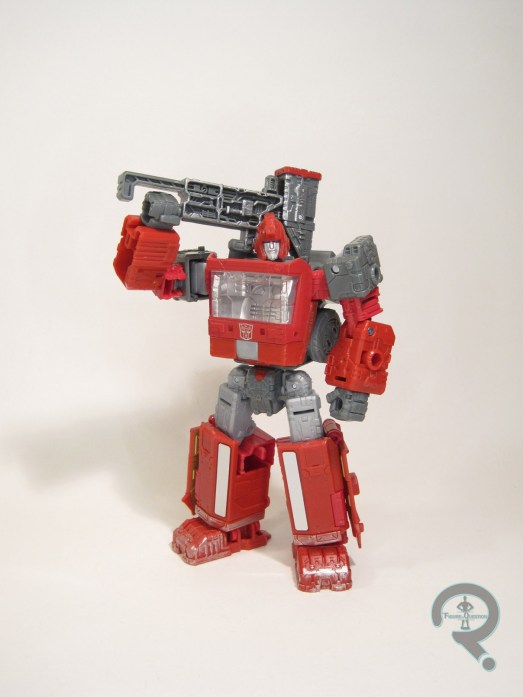 Ironhide kicks off the second Deluxe assortment of the War for Cybertron: Siege line. He continues the line’s heavy G1 influence, and is in fact one of Ironhide’s most show/comic accurate figures ever (I mean, hey, this one actually has a head, which is more than can be said of his original release). In robot mode, the figure stands 5 1/2 inches tall and he has 22 functioning points of articulation. As you may have noted on the height, Ironhide stands a half-inch taller than Sideswipe, and by extension, the rest of the Deluxe offerings for the line so far. Since Ironhide’s typically not depicted as being small, it makes sense, and its an interesting exploration of what can be done within the set “scales.” Of course, there do have to be some trade-offs to get him up to that larger size, so Ironhide has a few more hollow spots than some of the others. The legs and forearms are the primary spots of said hollow-ness. For the legs, he’s got panels that fold into place to hide this, so that works well enough. The arms have no such coverage, so there’s just a big opening at the back of each forearm. It’s a little obvious, but careful posing is enough to make it look alright. The rest of the sculpt is a solid offering. He’s boxier and more war-torn than the likes of Sideswipe, befitting the nature of the