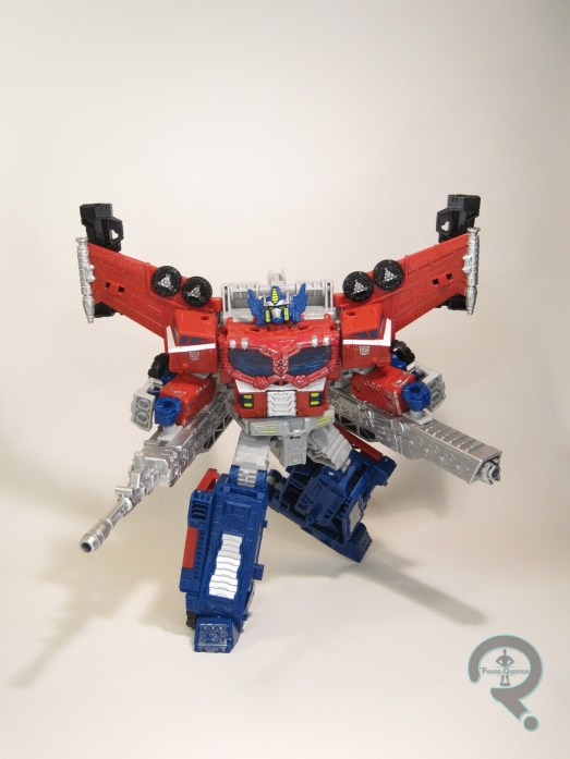Galaxy Upgrade Optimus Prime is one half of the second wave of Leader Class figures from Siege, with the other half being a re-issue of last wave’s Shockwave. Its our second (and as far as we know last) Optimus for Siege, serving as something of a mid-season-upgrade (or “Magical Girl Power-up” according to Super Awesome Fiancee, and then she said “Auto-Girls, roll out!” accompanied by an assortment of whooshing sounds). In his initial robot mode, he stands 7 1/4 inches tall and he has 22 points of articulation. As pretty much everyone had expected as soon as Ultra Magnus showed up with an all-new mold, this Optimus is built on the same base body. For the purposes of his fully armored up mode, there aren’t quite as many shared parts, with the only truly lifted parts being the “boots”, and even then they’re slightly modified, in order to streamline them a bit more from what Magnus was sporting. As a whole, streamlined is a good description for the armored up appearance. It’s fitting, seeing as it’s clearly meant for flight, what with the wings and all. The wings have been scaled down a bit from their prior appearance, likely in an effort to keep him within the new Leader Class scaling, but they’re still sizable enough to make the proper impression. The large cannons are permanently affixed to the wing pack, and I was initially expecting them to be a little bit restricting, but they actually have a decent range and fold up rather nicely on his back when they’re not in use.
